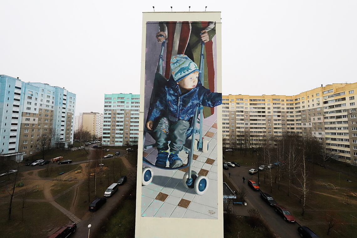 – На днях был, увидел центральный мурал – и офигел. Когда мне показали согласованный эскиз мурала (там нарисован ребенок в коляске. – Ред.), я даже не поверил, что он действительно появится на стене.
