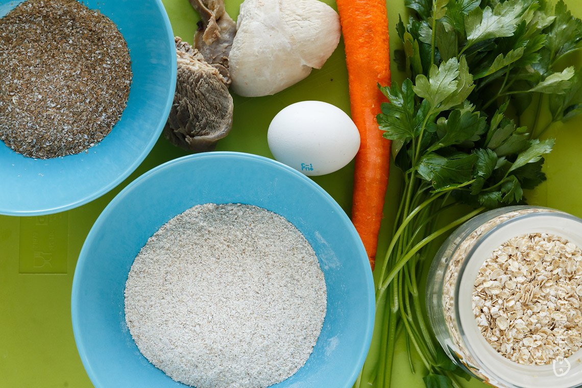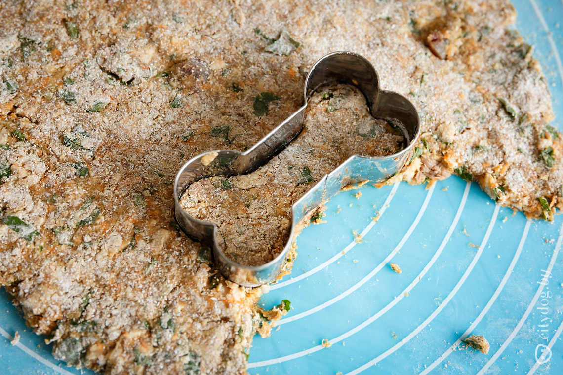 Рецепт печенья: говядина, индейка, яйцо, петрушка, морковка, ржаная мука, ржаные отруби и овсяные хлопья. Говядину и индейку мелко нарезать, натереть морковь, вбить в эту смесь яйцо и добавить муку, отруби и хлопья. Все перемешать, раскатать скалкой и вырезать любые формы. Запекать в духовке 30 минут при температуре 180 градусов.