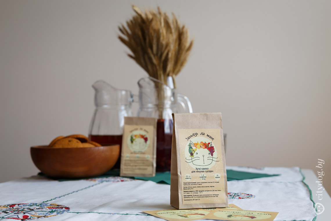 Наш компот называется «Заходзь да мяне», мы хотим на упаковках делать разные истории: факт о месте, из которого привезены яблоки, информация о бабушке, которая нам эти яблоки продала, или какие-то исторические факты.