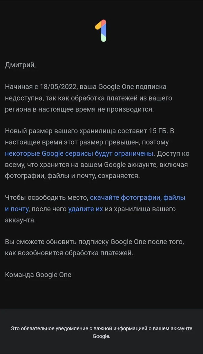 Dev.by сообщает, что облачный сервис хранения данных Google One, который позволяет архивировать данные со смартфонов с iOS или Android, скоро будет недоступен для белорусов. Письма об этом рассылает команда сервиса.