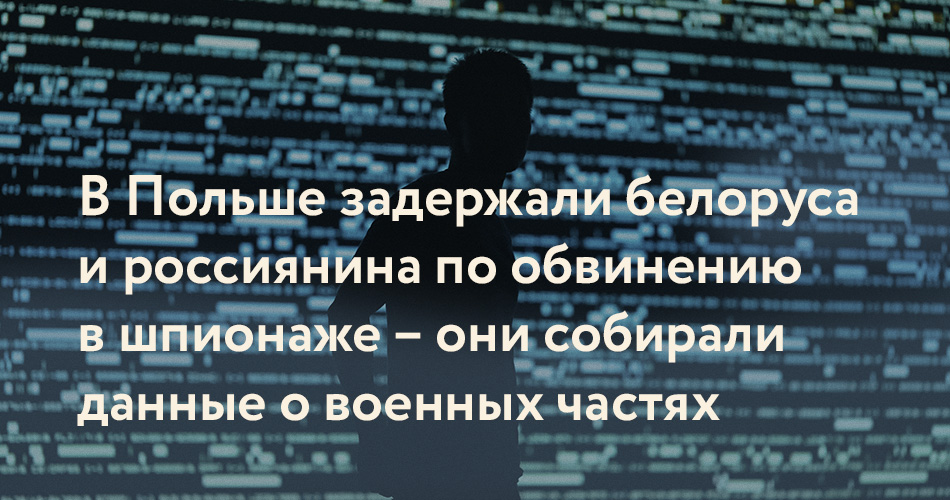 Польские спецслужбы задержали в Белостоке белоруса и россиянина по обвинению в шпионаже, сообщает Польское телевидение. Служба военной контрразведки Польши сообщила, что они собирали информацию о военных частях и их расположении, оснащении, кадровом составе, а также о подразделениях союзников.