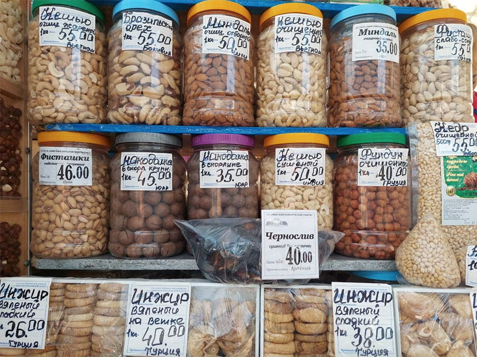 Идем дальше вдоль рядов и заворачиваем к точкам с сухофруктами и орехами. Вот здесь никакого ажиотажа, очередей, продавцы явно скучают и рады всем, кто подходит. Что по ценам? Инжир – 35 руб., сушеное манго – 42 руб., фундук – 40 руб., кешью – 40–45 руб., миндаль – 55 руб.