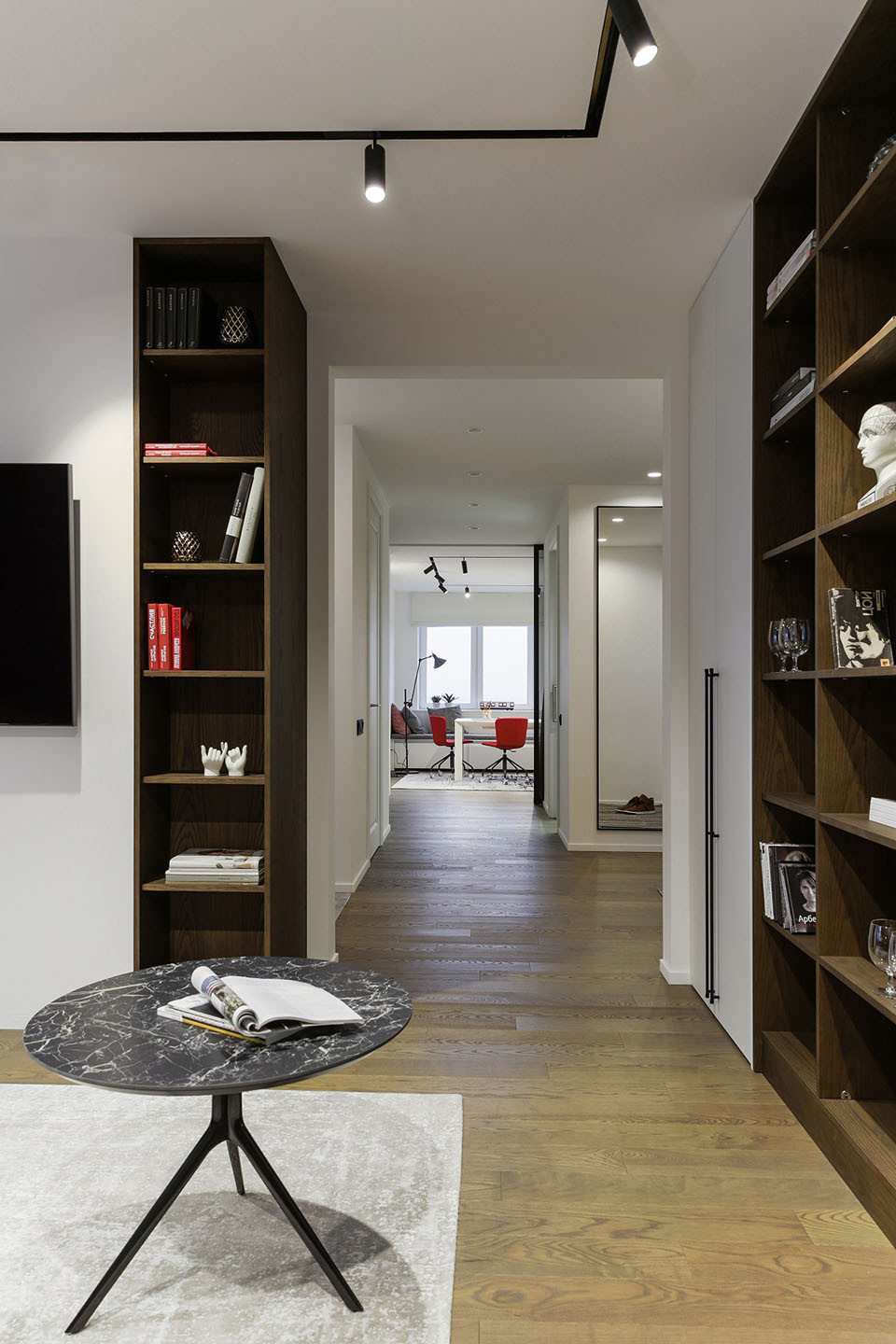 – Заказчики очень любят читать, поэтому центральное место в гостиной занял большой открытый стеллаж – постепенно он будет наполняться целыми сериями книг любимых авторов хозяев, – рассказывает Марьяна.