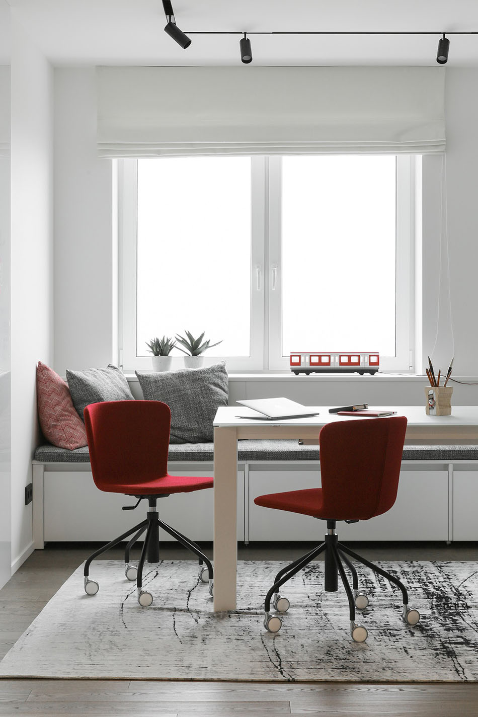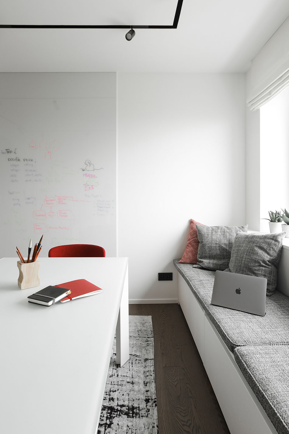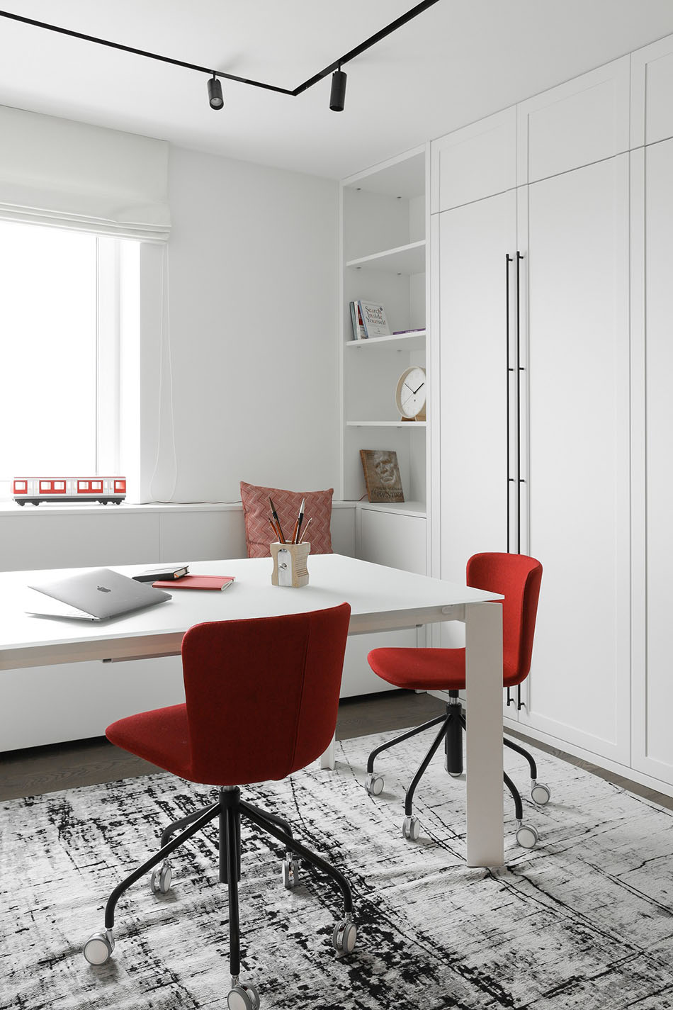 За высокой прозрачной дверью – большой рабочий стол, шкафы и стеллажи для хранения необходимых предметов, мягкое сиденье вдоль стены у окна и специальная доска для рисования высотой от пола до потолка. В одном из шкафов-трансформеров спрятана кровать, предусмотренная для гостей. Внешне она абсолютно никак себя не выдает, а при необходимости легко решает проблемы размещения для ночевки.