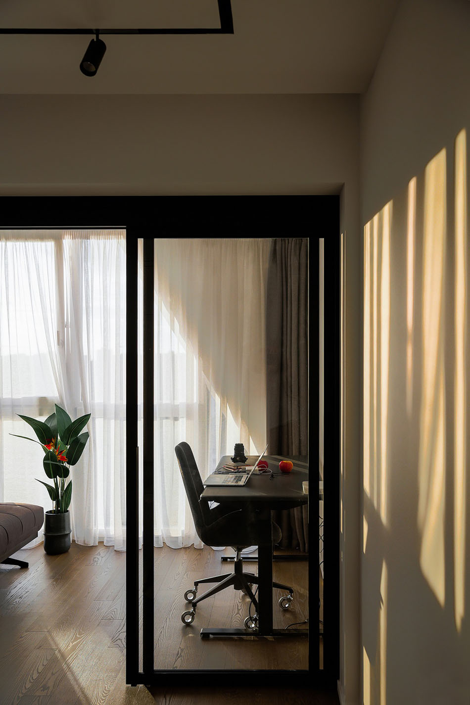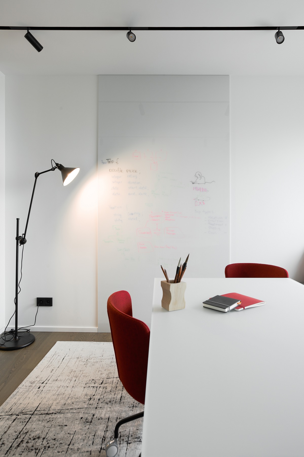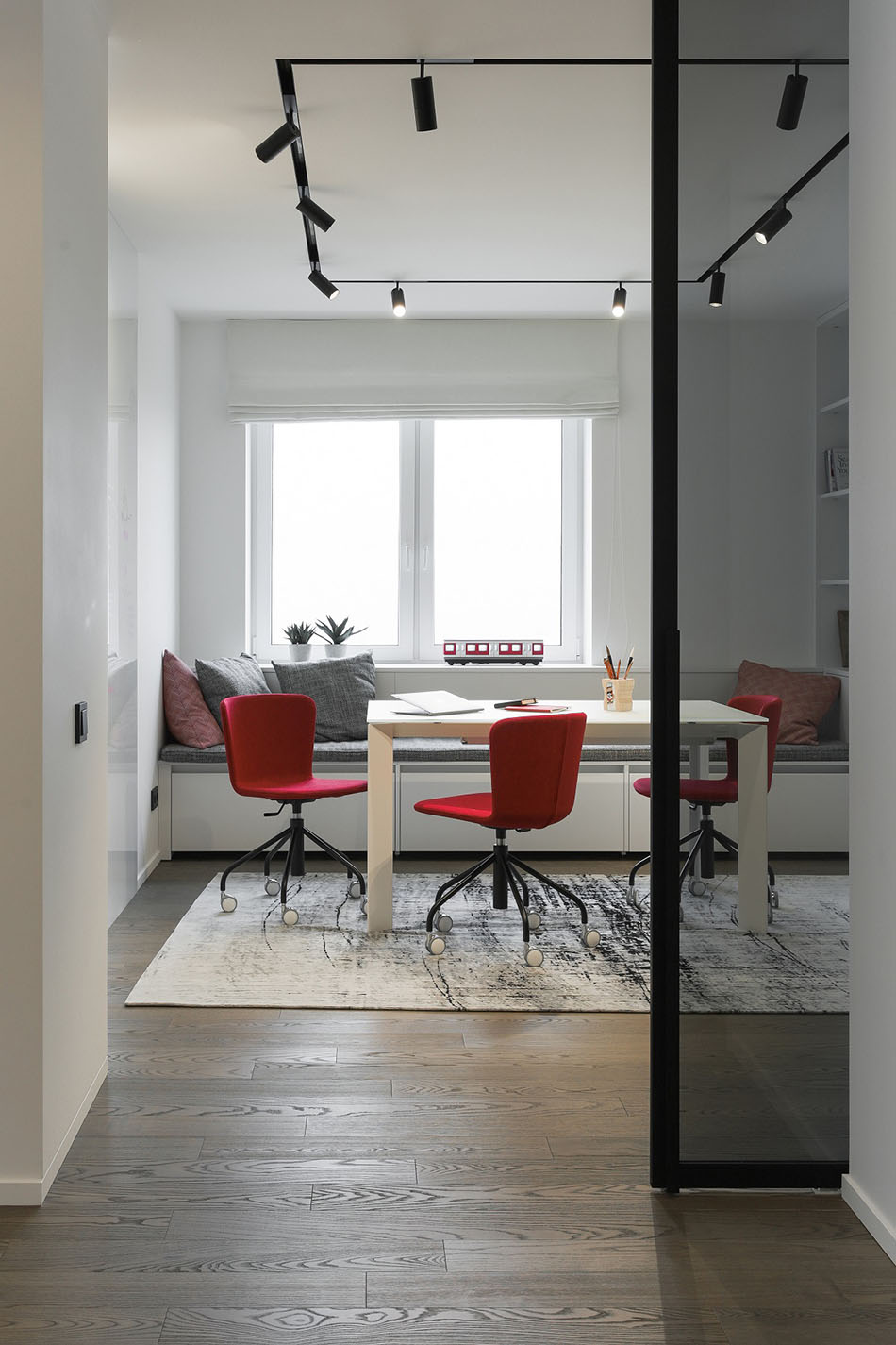 За высокой прозрачной дверью – большой рабочий стол, шкафы и стеллажи для хранения необходимых предметов, мягкое сиденье вдоль стены у окна и специальная доска для рисования высотой от пола до потолка. В одном из шкафов-трансформеров спрятана кровать, предусмотренная для гостей. Внешне она абсолютно никак себя не выдает, а при необходимости легко решает проблемы размещения для ночевки.