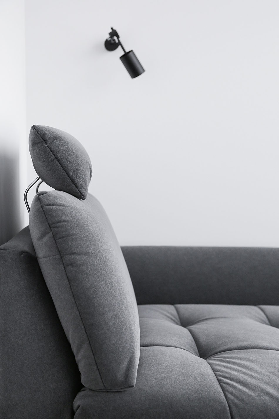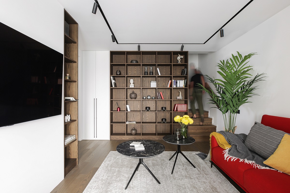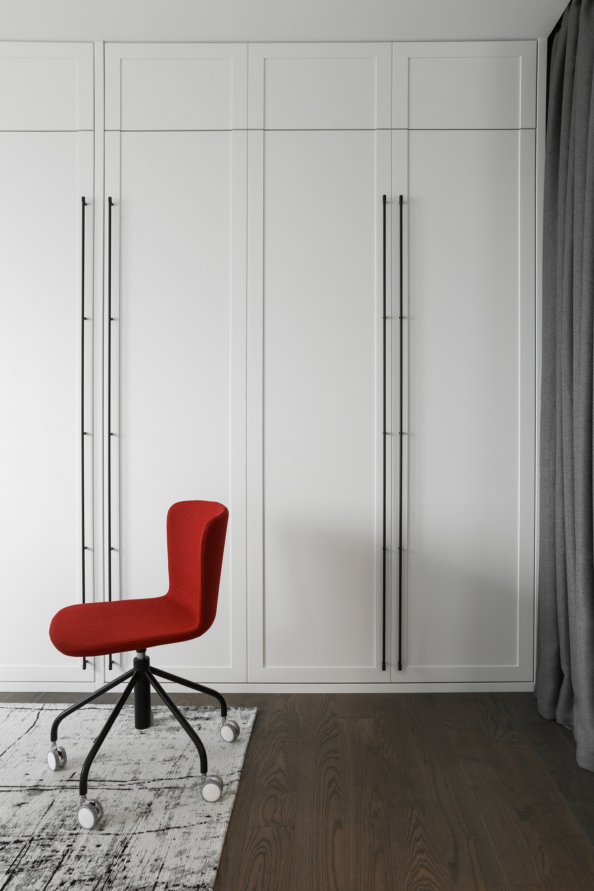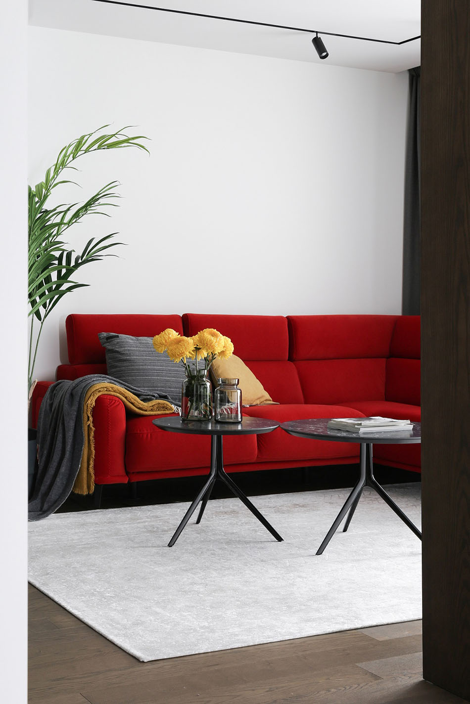 – Ярким акцентом в этой комнате выступает красный диван. Вообще, акценты в этом проекте мы расставляли именно при помощи мебели, в то время как отделку и строительные материалы выбирали в нейтральных оттенках. Все-таки, если какой-то цвет надоест, поменять диван гораздо проще, чем, например, перекладывать плитку в ванной или перекрашивать стены по всей квартире.