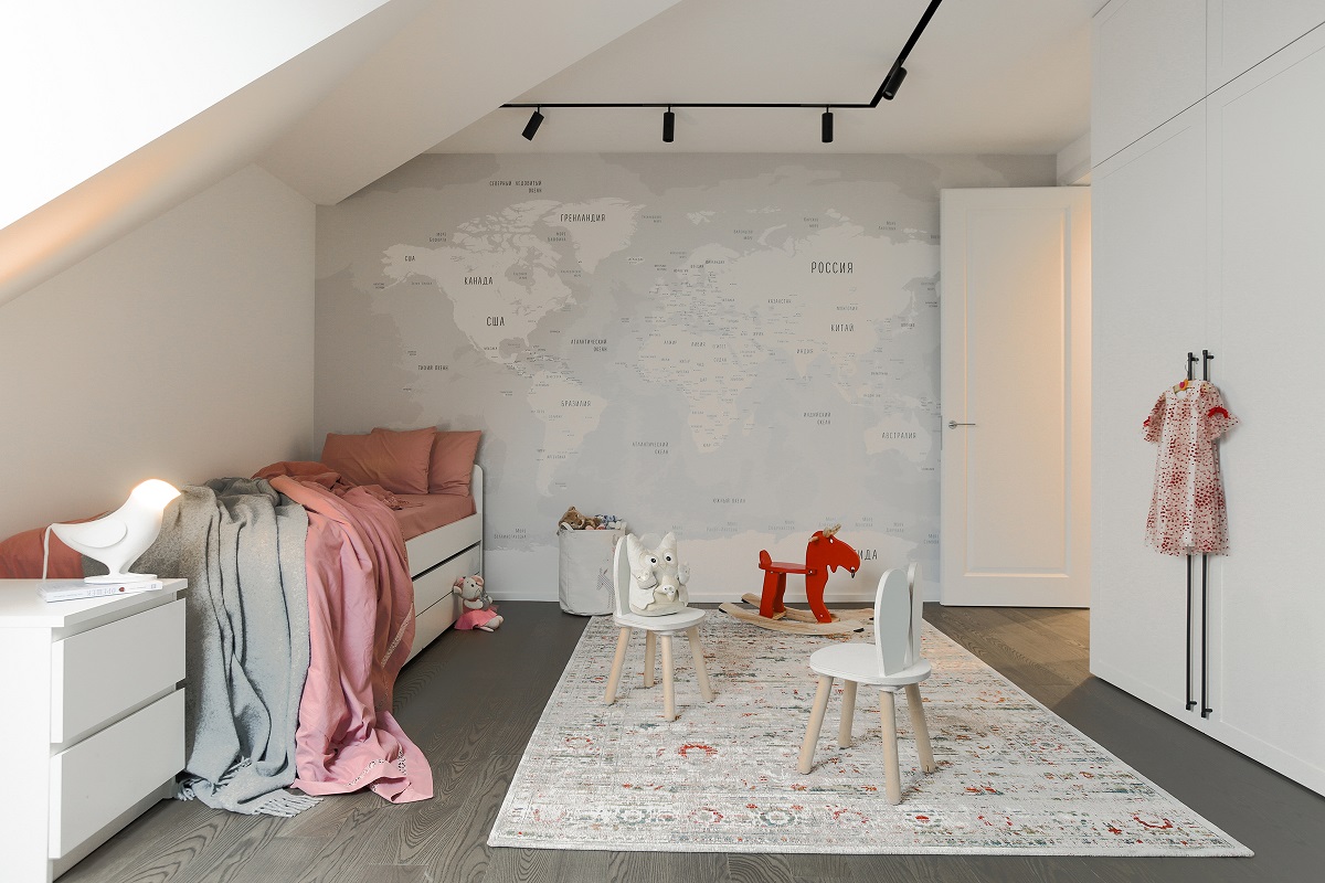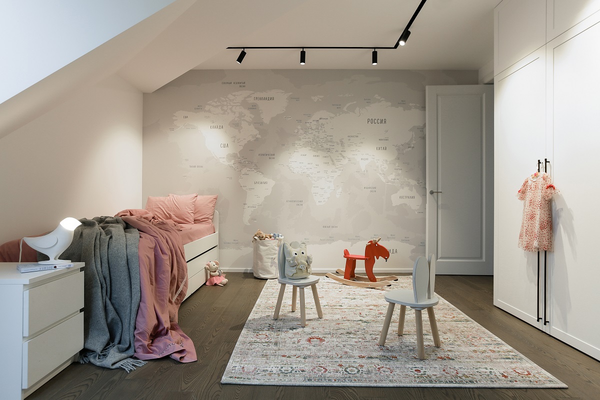 На одной из стен – большая карта мира, сделанная как единое полотно под определенный размер. А сама комната может выглядеть по-разному в зависимости от освещения.