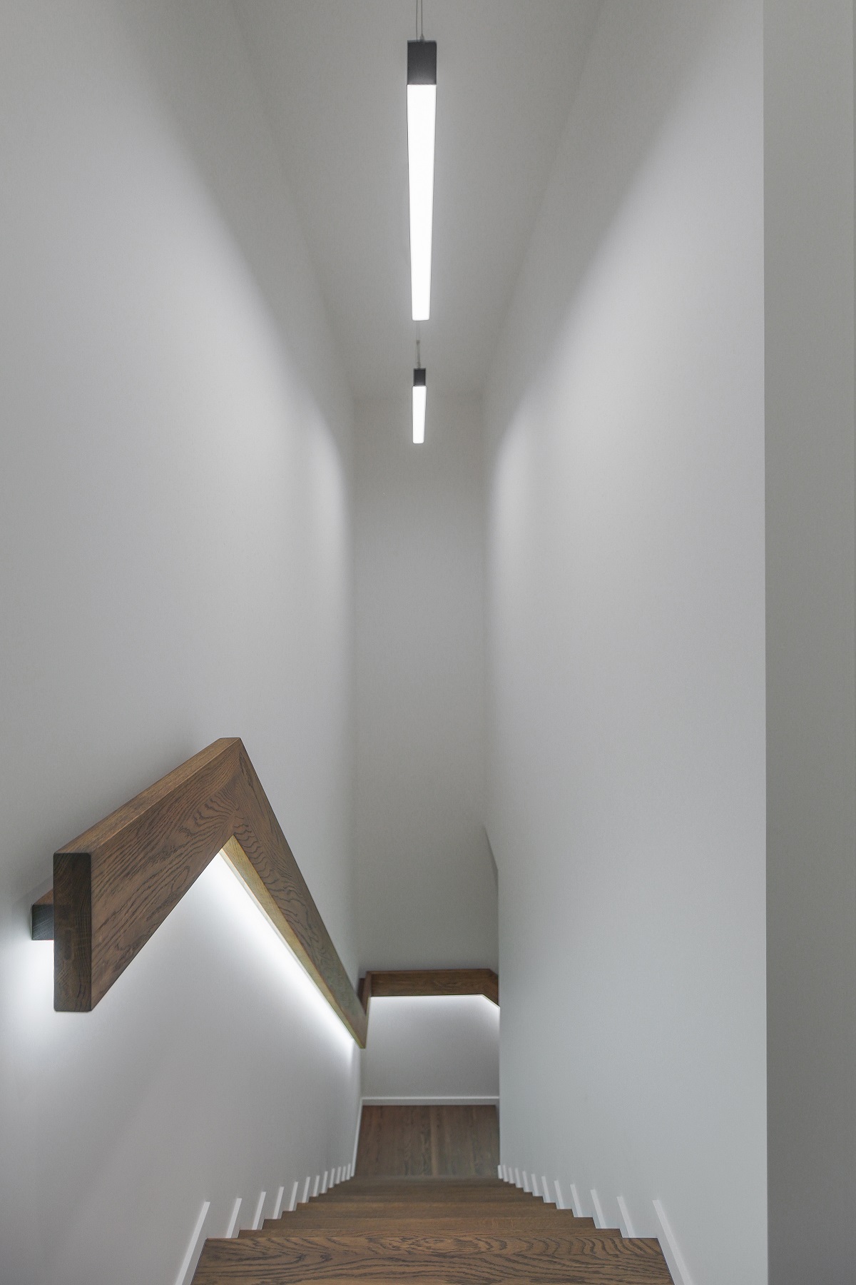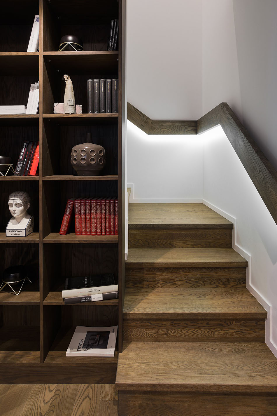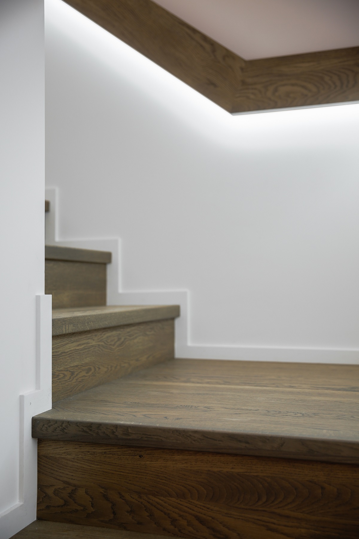 Из гостиной идет лестница на второй этаж. Ступени покрыли деревом, а перила, по цвету и фактуре подобранные под паркет, дополнили подсветкой.