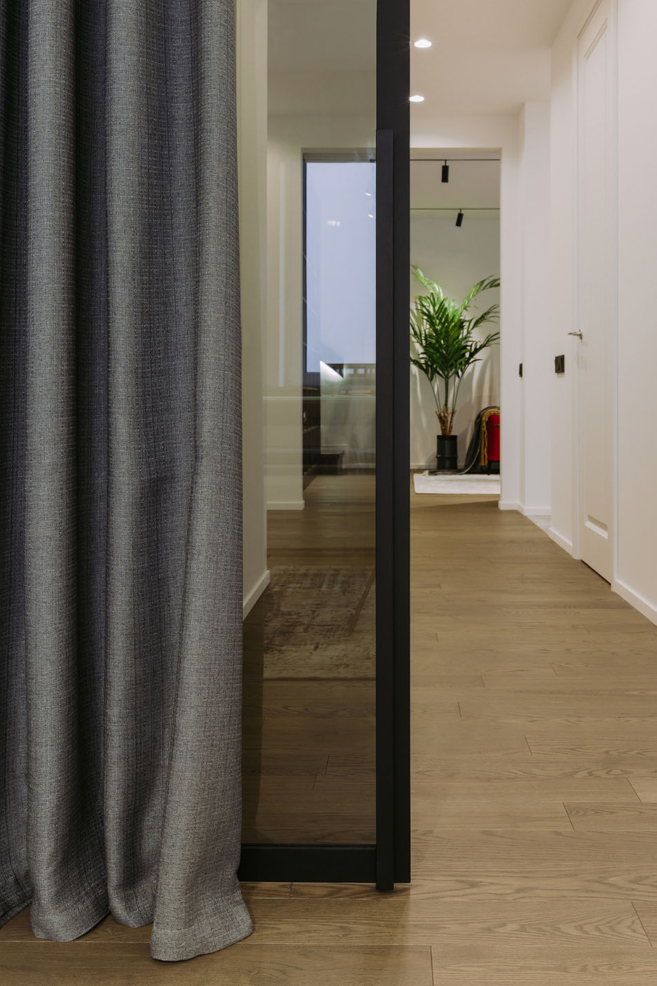 Из-за того, что квартира разбита на два этажа, потолки в помещениях получились невысокими. Поэтому в отделке авторы проекта старались использовать только светлые цвета, визуально увеличивающие пространство. Чтобы добавить больше дневного света, проемы на лоджиях увеличивали, а двери ставили прозрачные раздвижные, сделанные на заказ.