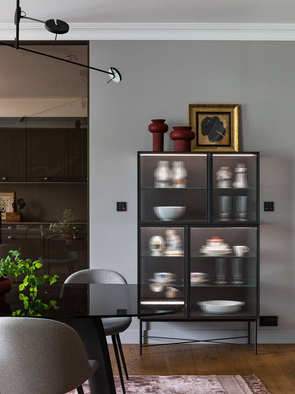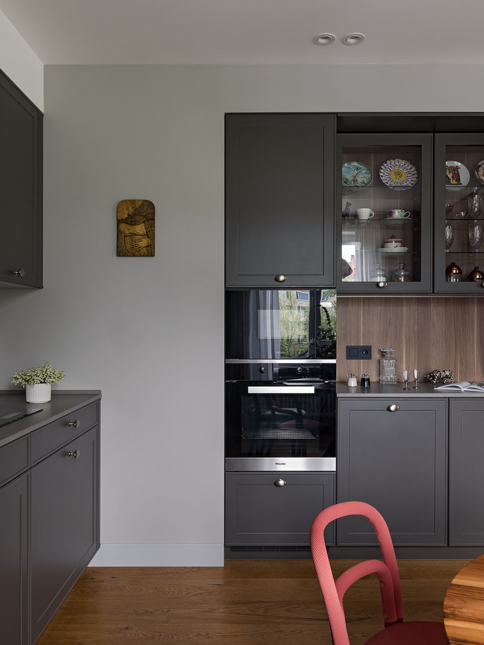 Саму кухню слегка увеличили за счет заглубленных шкафов-колонн и отделили от гостиной стеклянными перегородками – при желании их можно закрыть и полностью изолировать помещение.