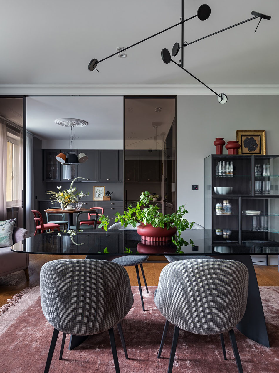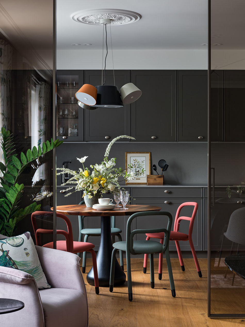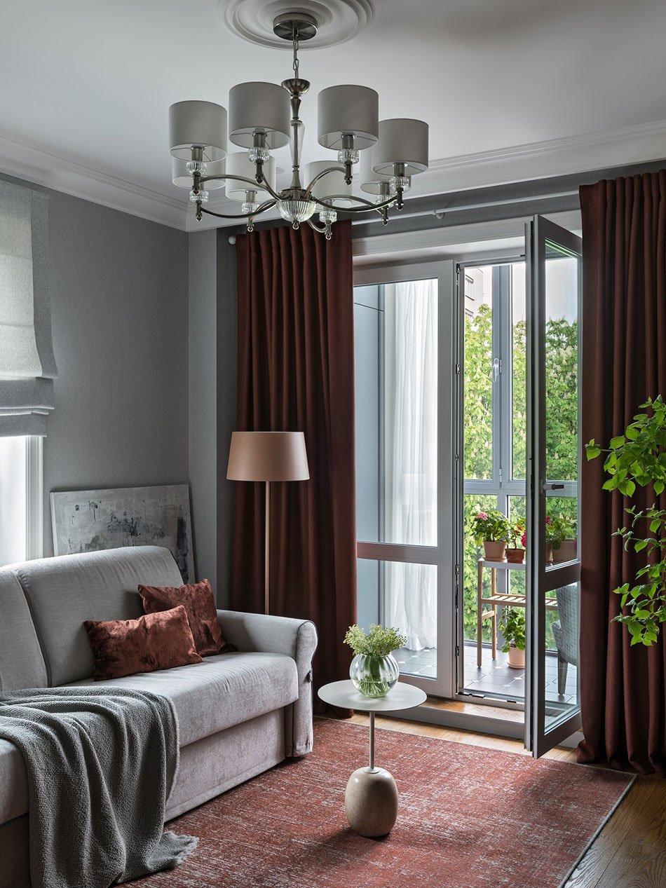 – Хозяйке нравились разные элементы из разных стилей, поэтому перед нами стояла задача все это объединить в одну общую гармоничную картину. Это и определило жанр всего интерьера, который получился довольно разноплановым, – рассказывает Александр. – Здесь и элементы современного интерьера, и отсылка к 1960-м, и лепнина на потолке, и птички на шторах – и в то же время есть, скажем, современные светильники и выверенная архитектура всего пространства, что тоже очень важно.