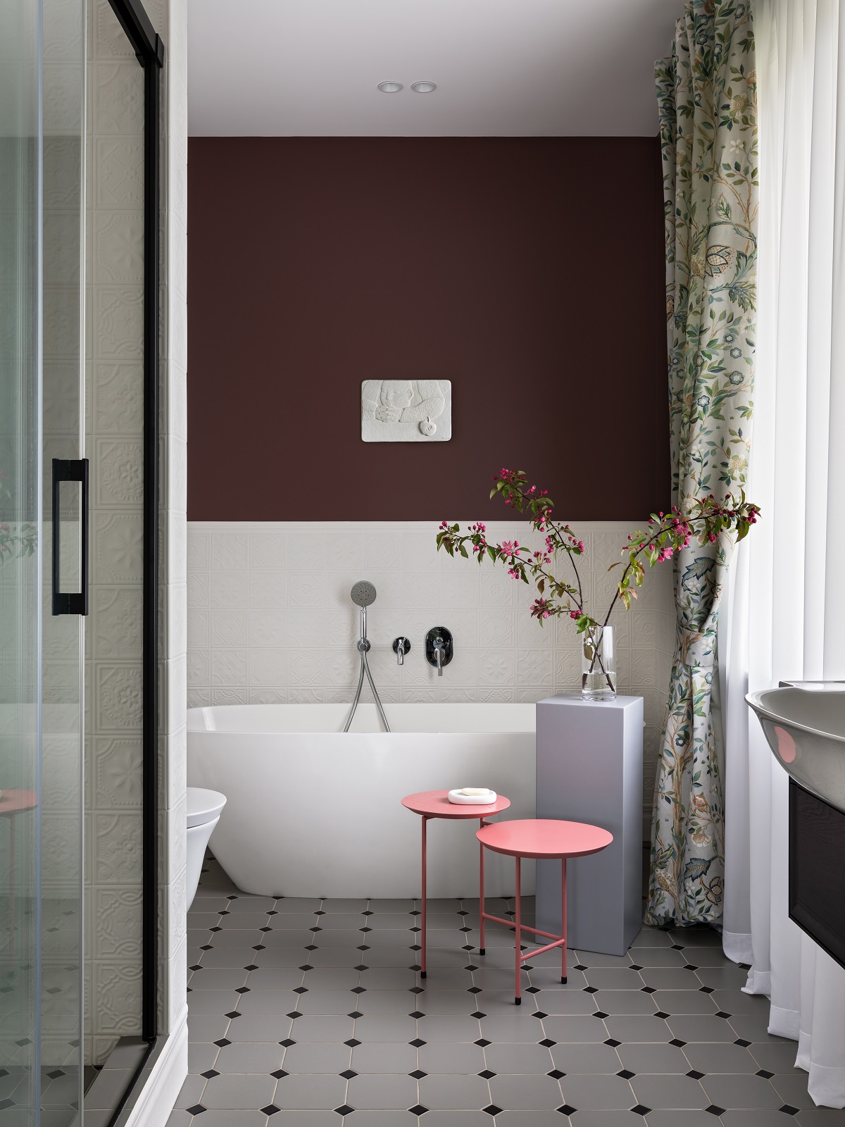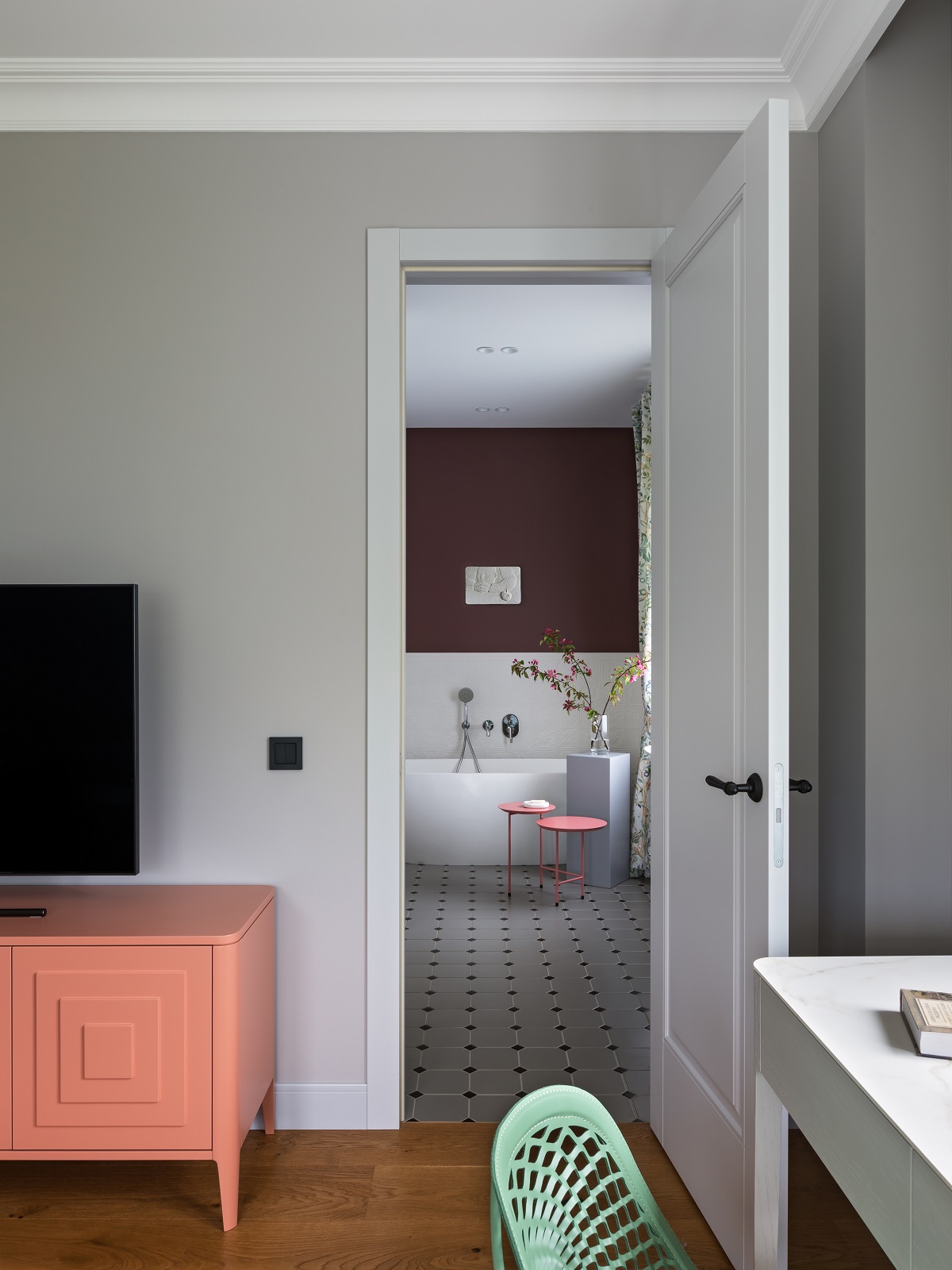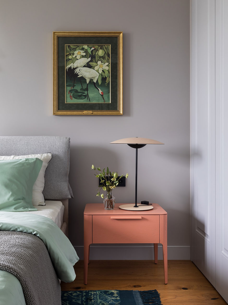 – Хозяйке нравились разные элементы из разных стилей, поэтому перед нами стояла задача все это объединить в одну общую гармоничную картину. Это и определило жанр всего интерьера, который получился довольно разноплановым, – рассказывает Александр. – Здесь и элементы современного интерьера, и отсылка к 1960-м, и лепнина на потолке, и птички на шторах – и в то же время есть, скажем, современные светильники и выверенная архитектура всего пространства, что тоже очень важно.