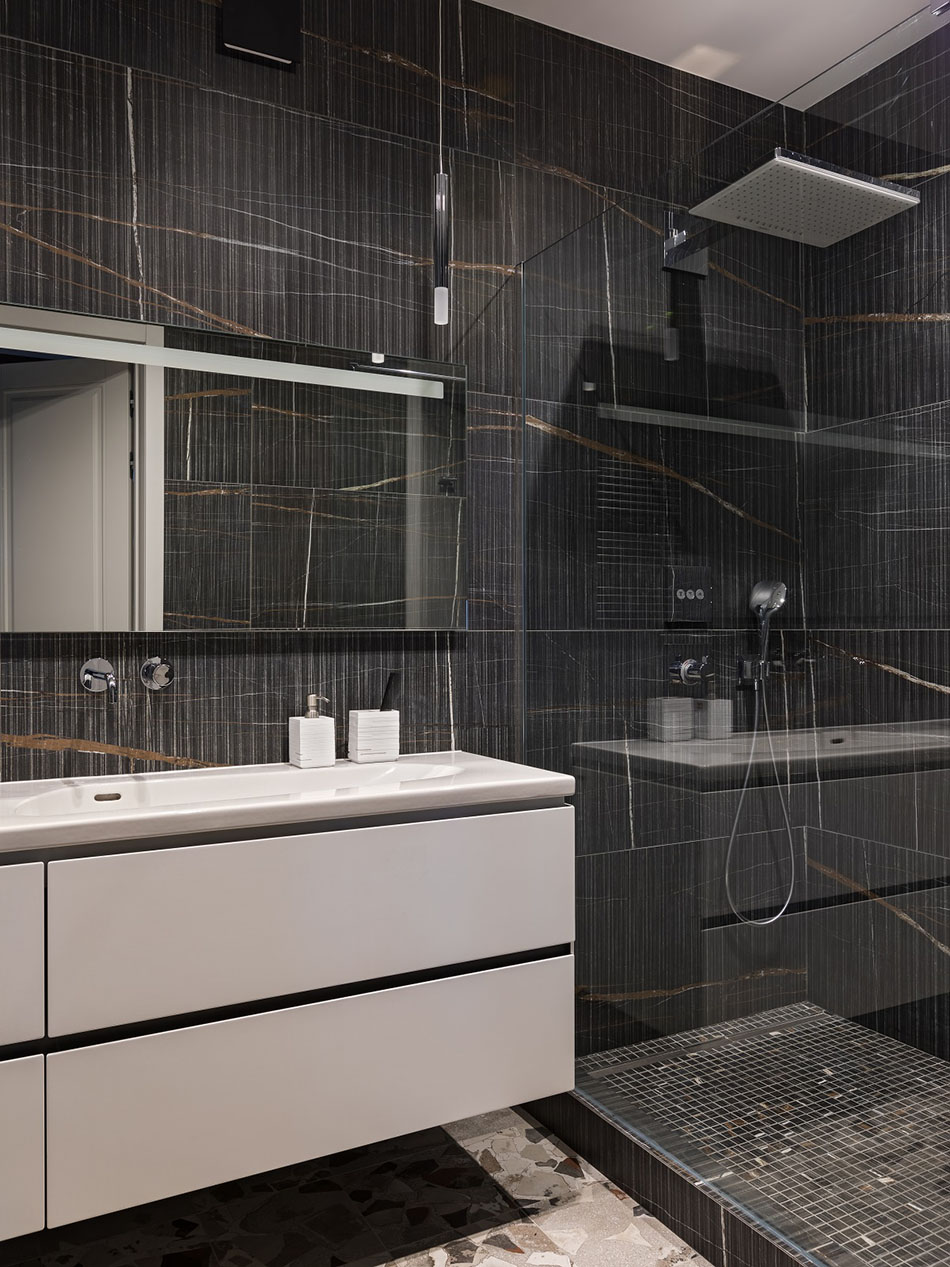 В коридоре практически напротив кабинета расположен второй санузел с душевой кабиной, выполненный в достаточно темных, брутальных тонах.