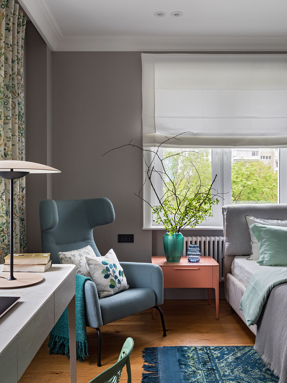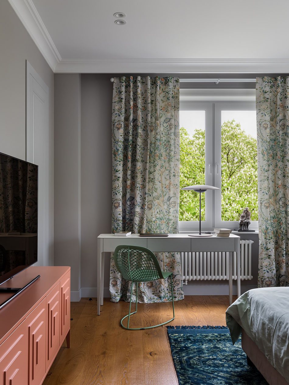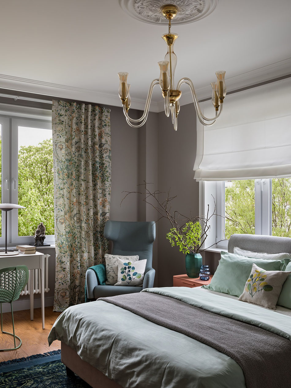 Дополнительно в спальне разместили рабочее место для хозяйки дома и зону отдыха с большим удобным креслом. Выглядит все очень стильно и уютно, а расцветка штор, опять же, создает ощущение не квартиры в высотке, а спокойного дома за городом в окружении деревьев.