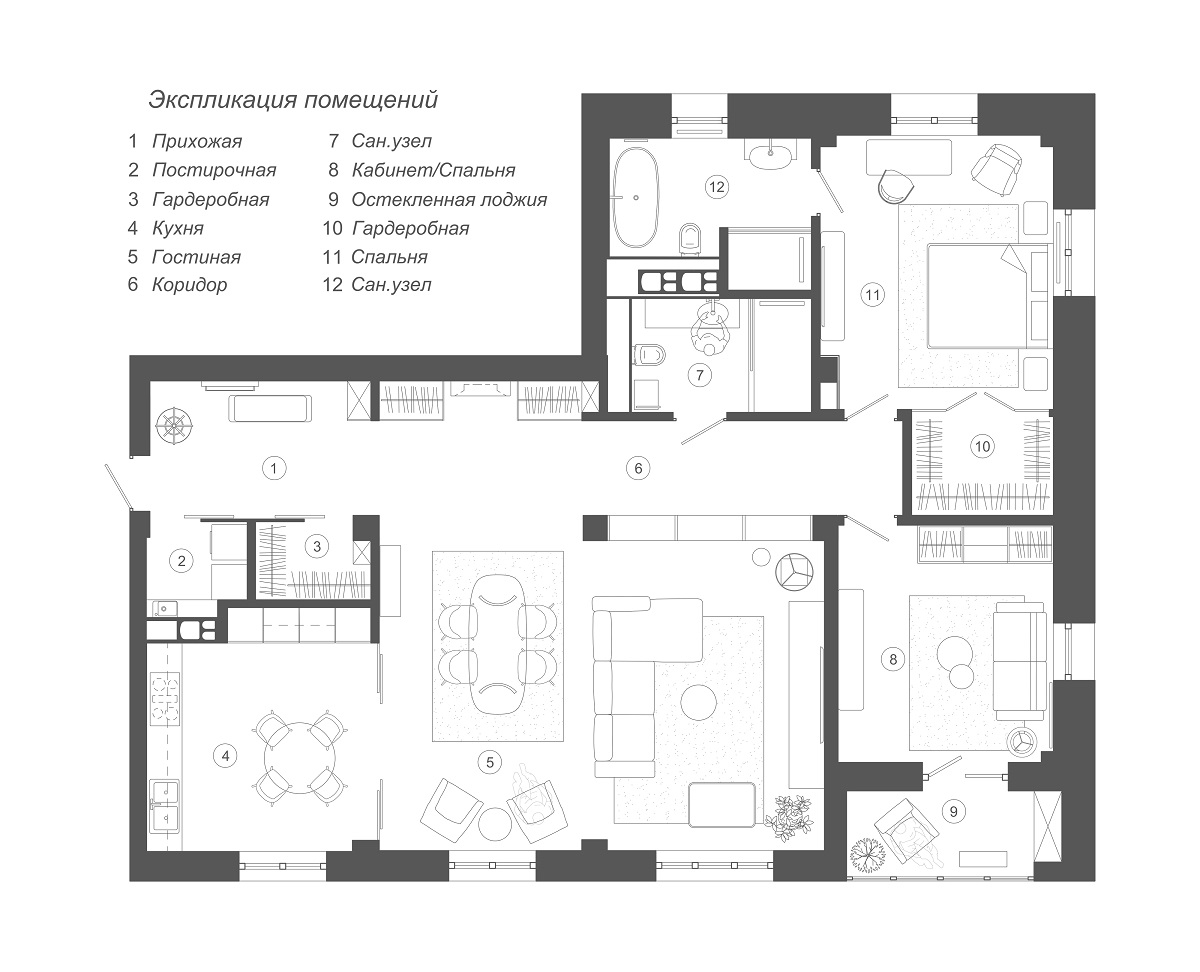 Как отметил Александр, обычно в квартирах все располагается довольно компактно, и о таких зонах приходится забыть. Но в этом проекте благодаря тому, что заказчики собирались жить только вдвоем, не было необходимости делать дополнительные комнаты и экономить пространство.