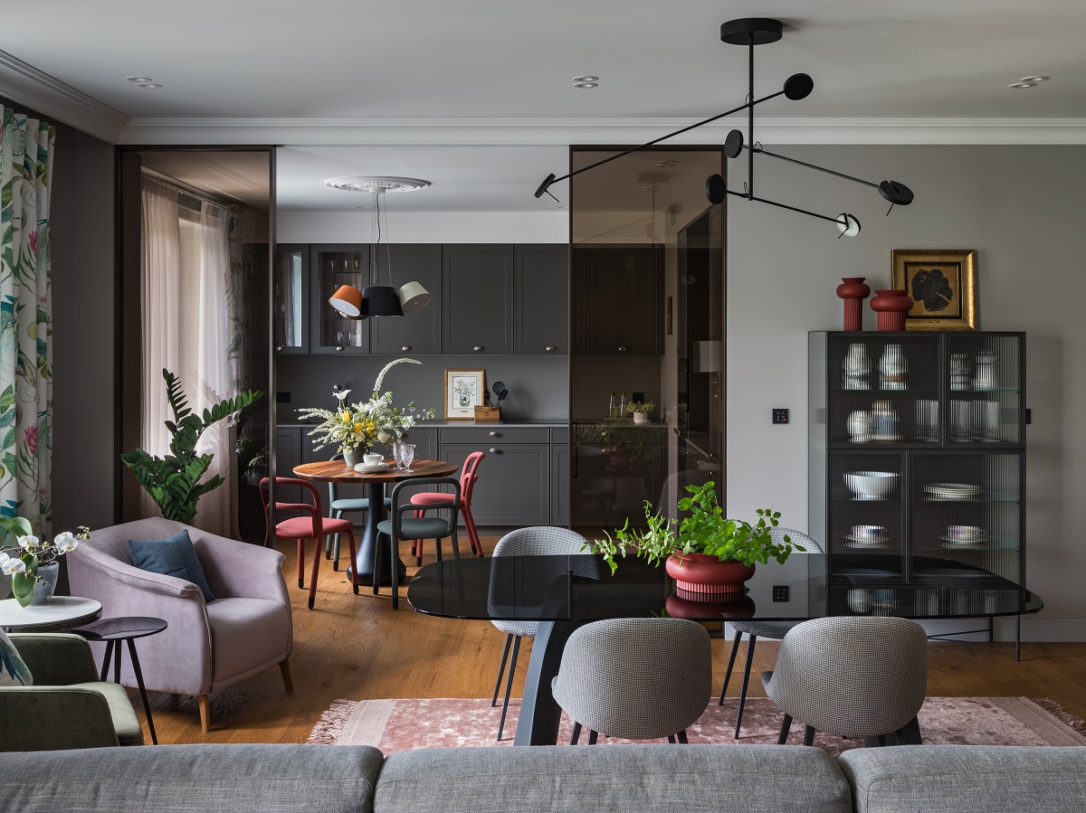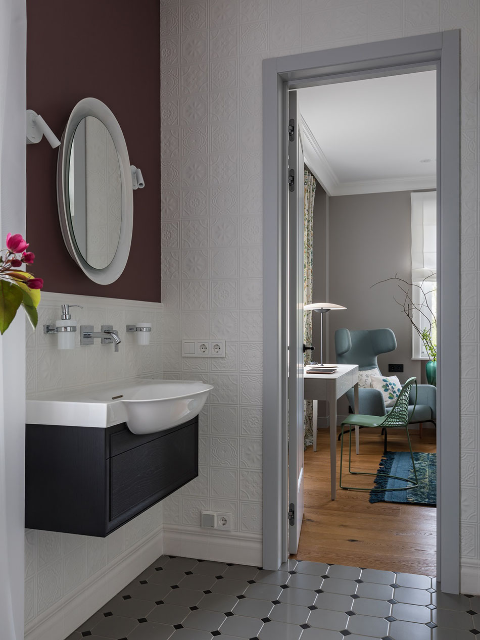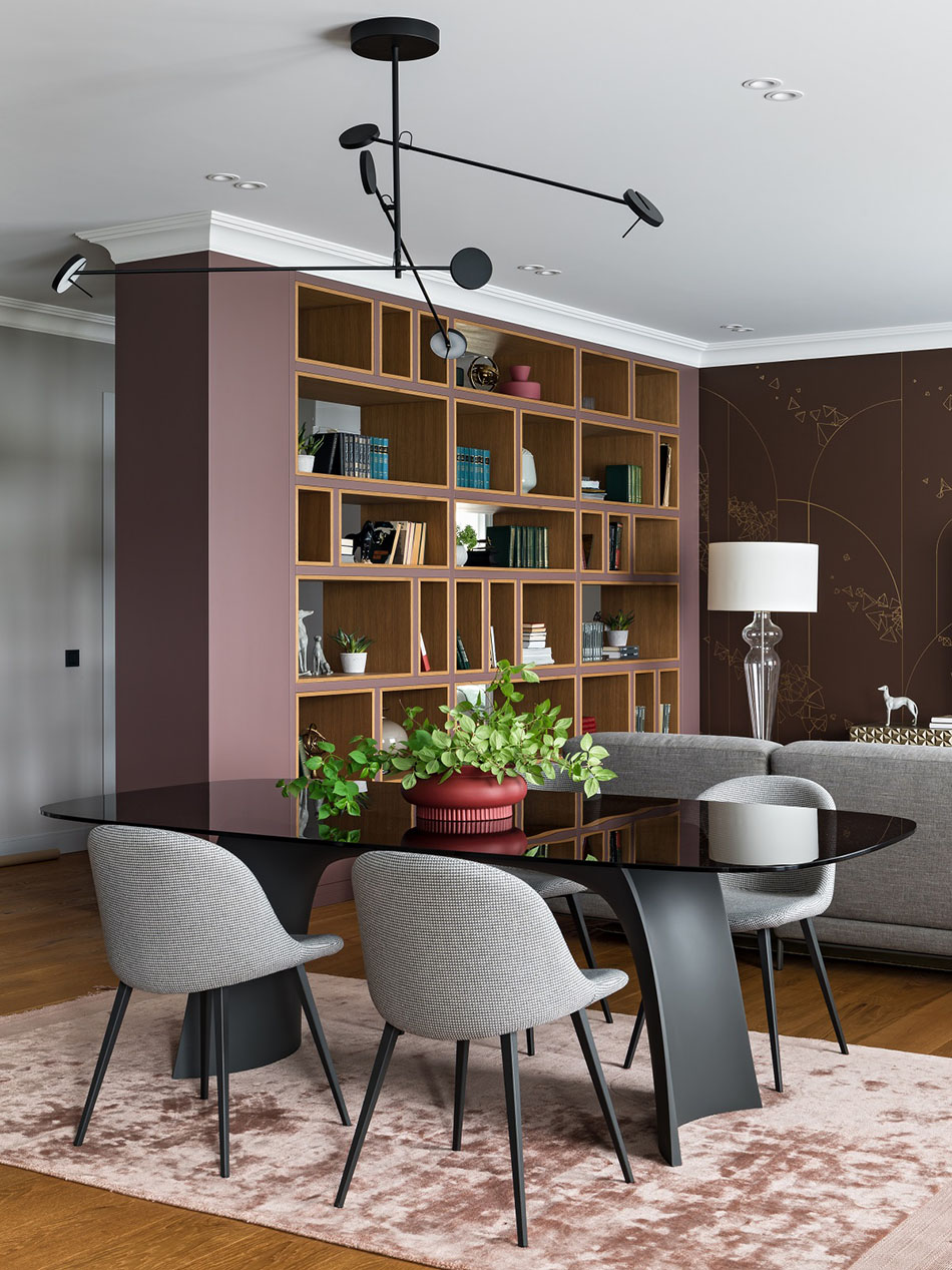 Этот проект – как результат компромисса между пожеланиями заказчицы и авторской задумкой архитектора. Благодаря этому в интерьере можно заметить и смешение стилей, и выделение зон с помощью цвета, и смелое сочетание сложных приглушенных цветов.