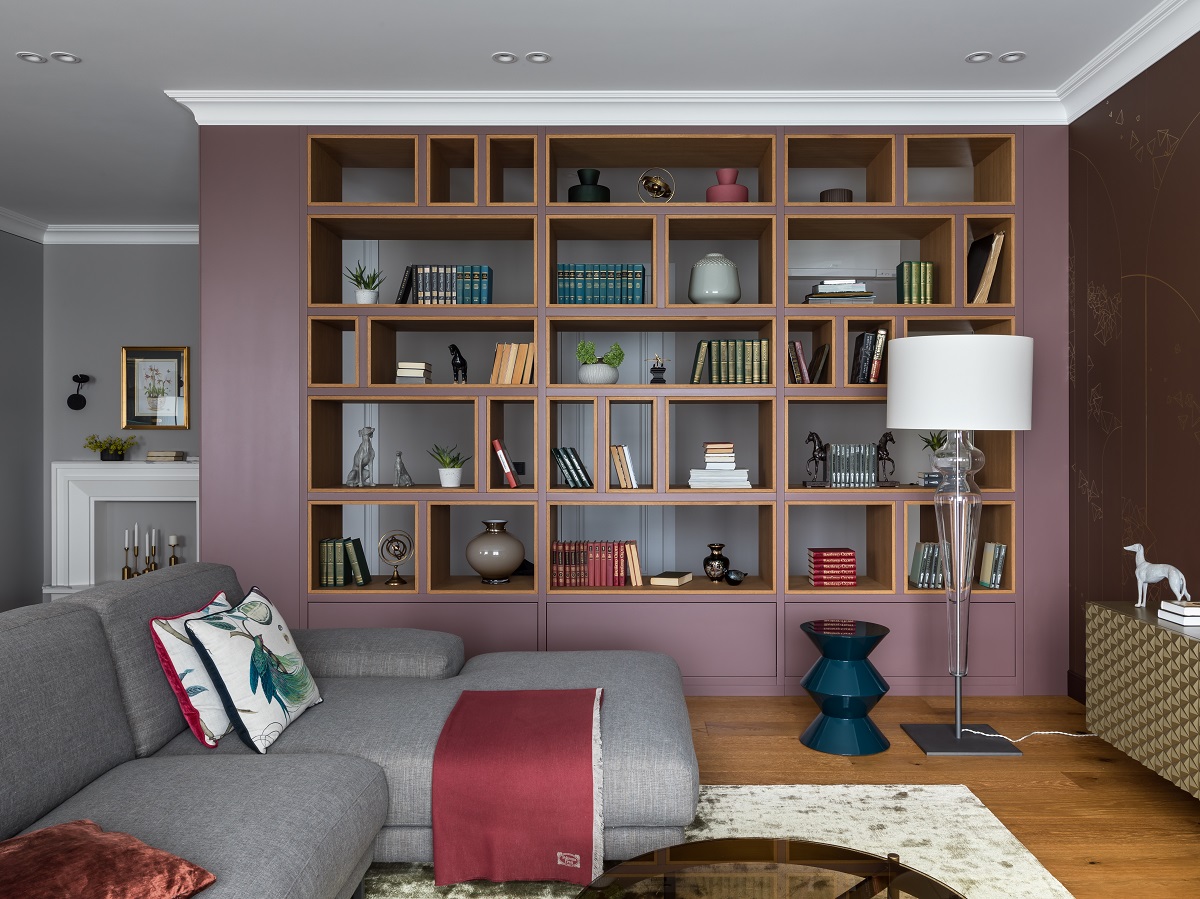В гостиной они были интегрированы в большой стеллаж, что позволило отделить зону коридора и закрыть вход в санузел. А благодаря тому, что стеллаж «работает» на просвет, в помещении удалось сохранить ощущение воздуха.