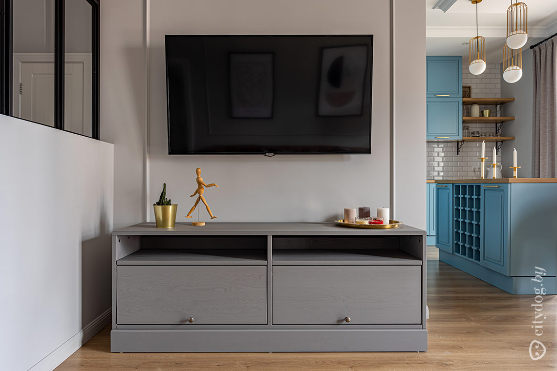 Елизавета говорит, что кухня полностью сделана на заказ (ее и все шкафы в квартире делали одни и те же мастера), а комоды в гостиную девушка заказывала в IKEA – мебельщики просто покрасили их в серый цвет.