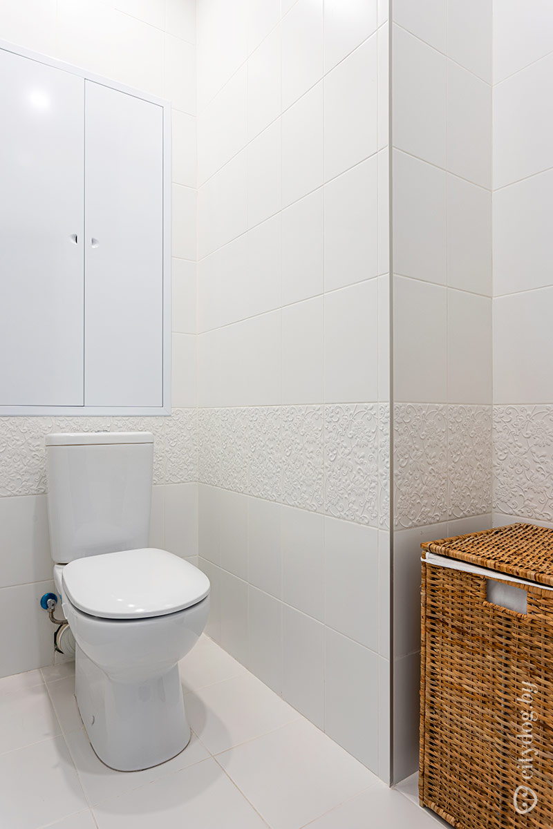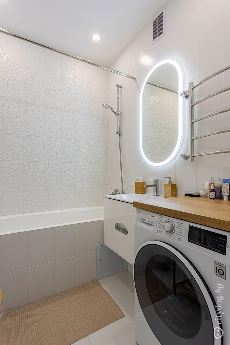 Здесь хозяйка квартиры почти ничего не меняла: плитка, раковина и шкаф под ней, унитаз – все от застройщика. Столешницу над стиральной машиной Елизавета попросила мебельщиков сделать из оставшегося материала, который использовали для кухни. Еще поменяли кран в умывальнике, купили зеркало с подсветкой и всякие мелочи.
