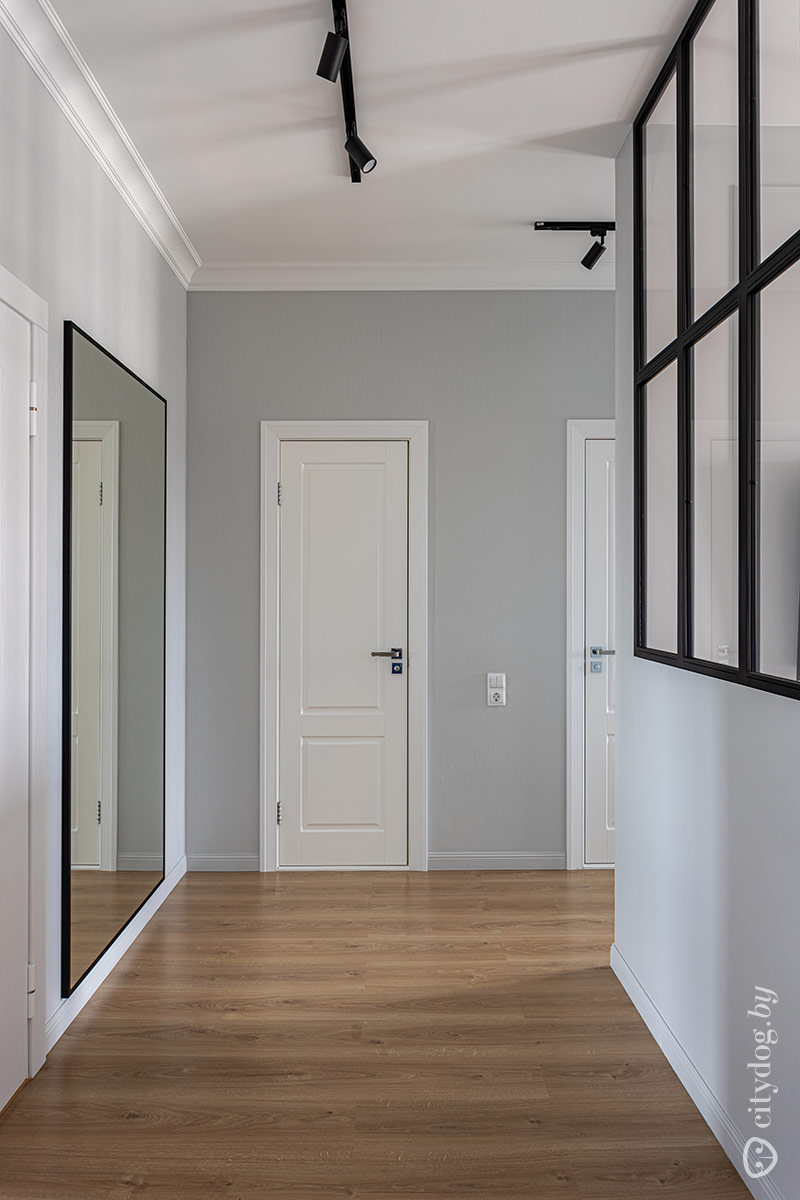 Из отделки застройщика «А-100 Девелопмент» в квартире: ламинат, двери, обои под покраску. Добавили молдинги, плинтусы, изменили электрику.