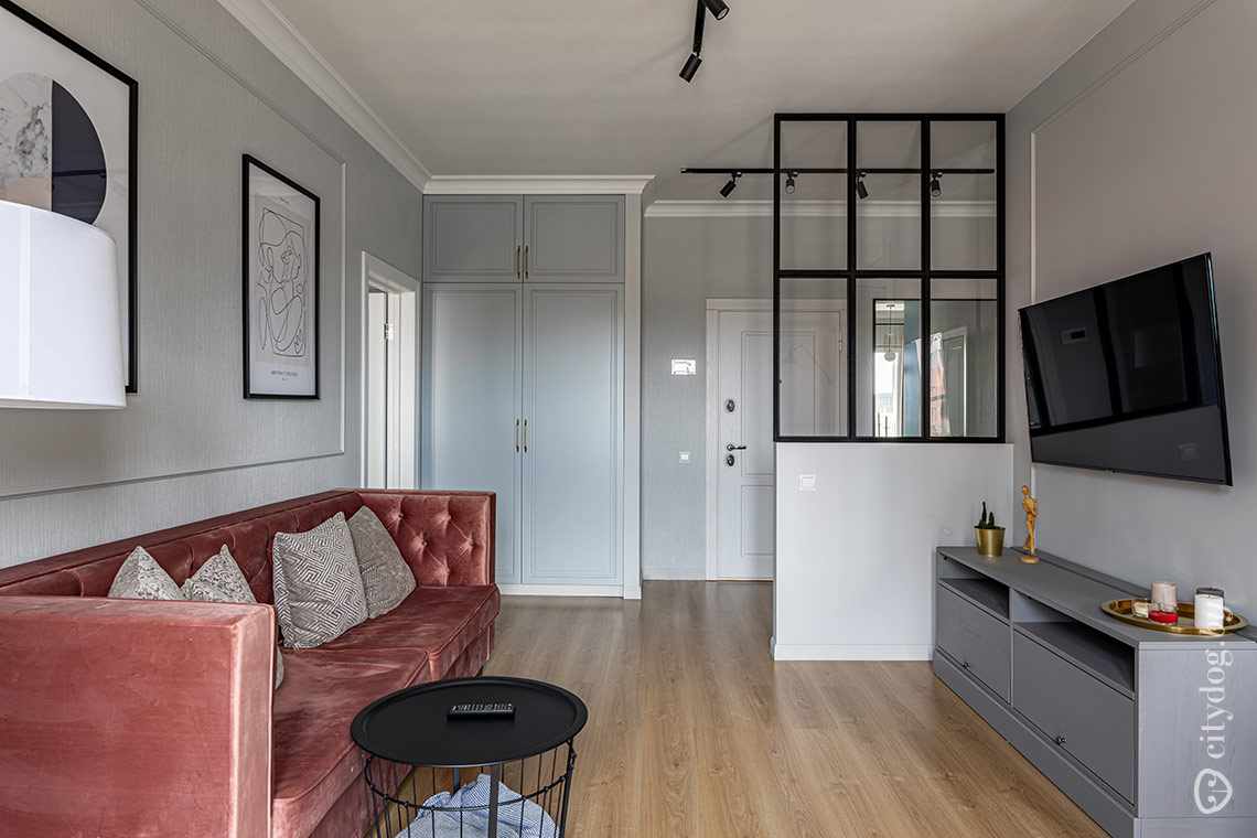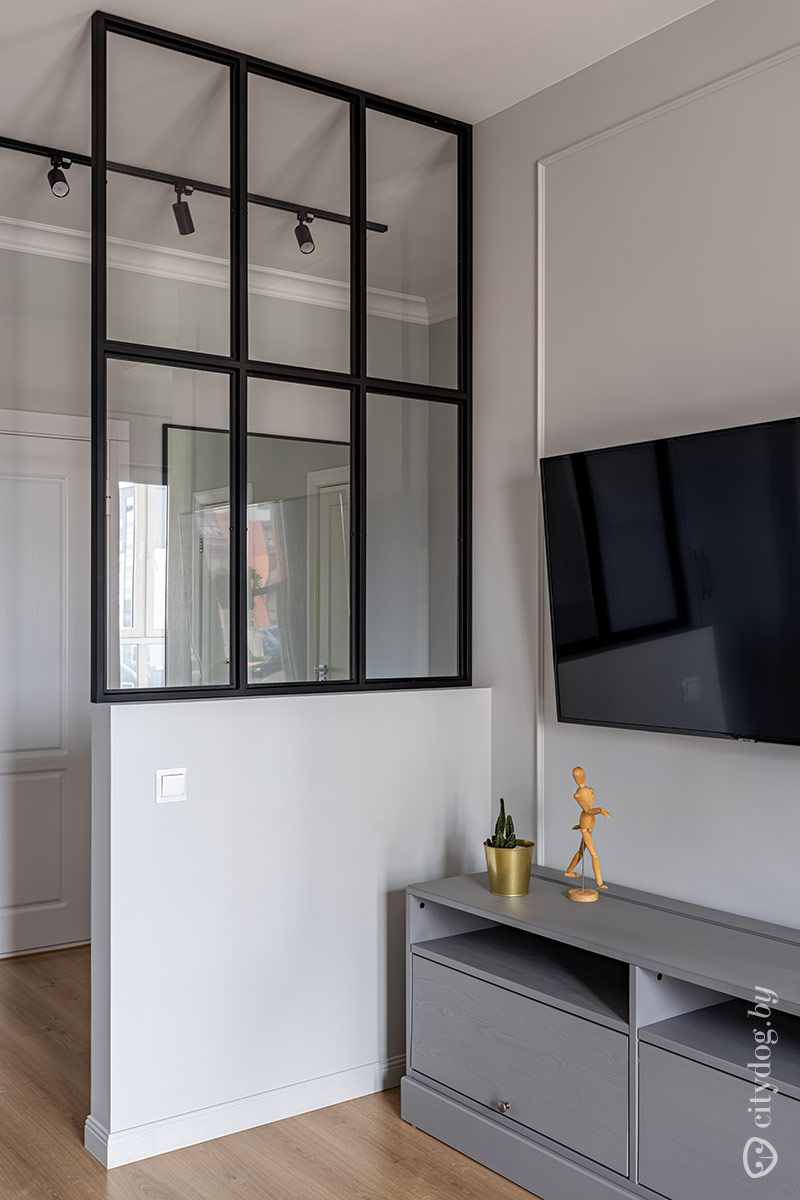 По словам Елизаветы, перепланировку в квартире не делали, но расширили с двух сторон колонну, где сейчас расположен телевизор, – она была намного уже. Плюс добавили сбоку перегородку с остеклением, чтобы разделить зоны: «Так удобнее: входя в квартиру, попадаешь в прихожую, а не сразу в гостиную».