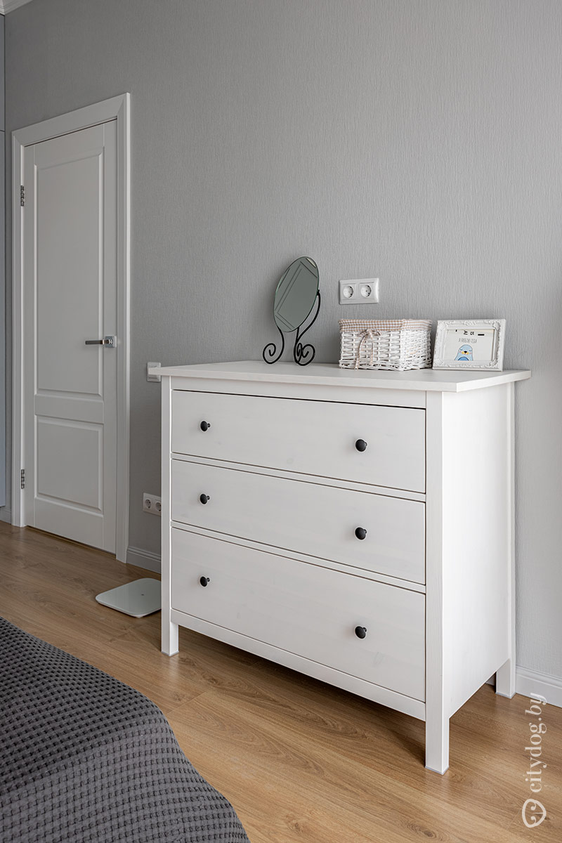 Комод, прикроватный столик и мелкие элементы декора, которые вы видите здесь и во всей квартире, я заказывала в IKEA. Кровать – из салона.