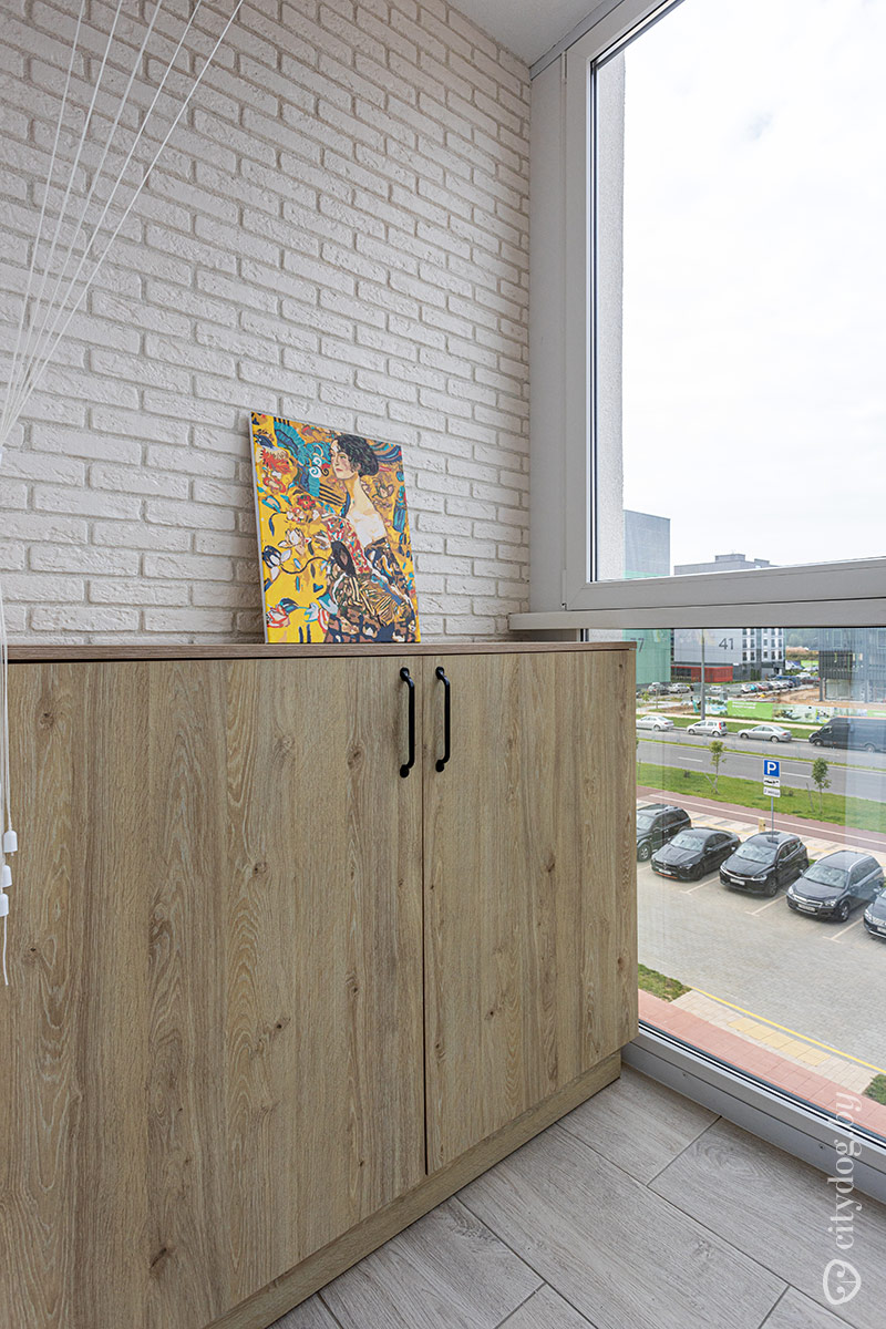 В квартире у Елизаветы два балкона, один из которых находится в спальне. Здесь стену оформили декоративным кирпичом и поставили два шкафа для хозяйственной утвари.