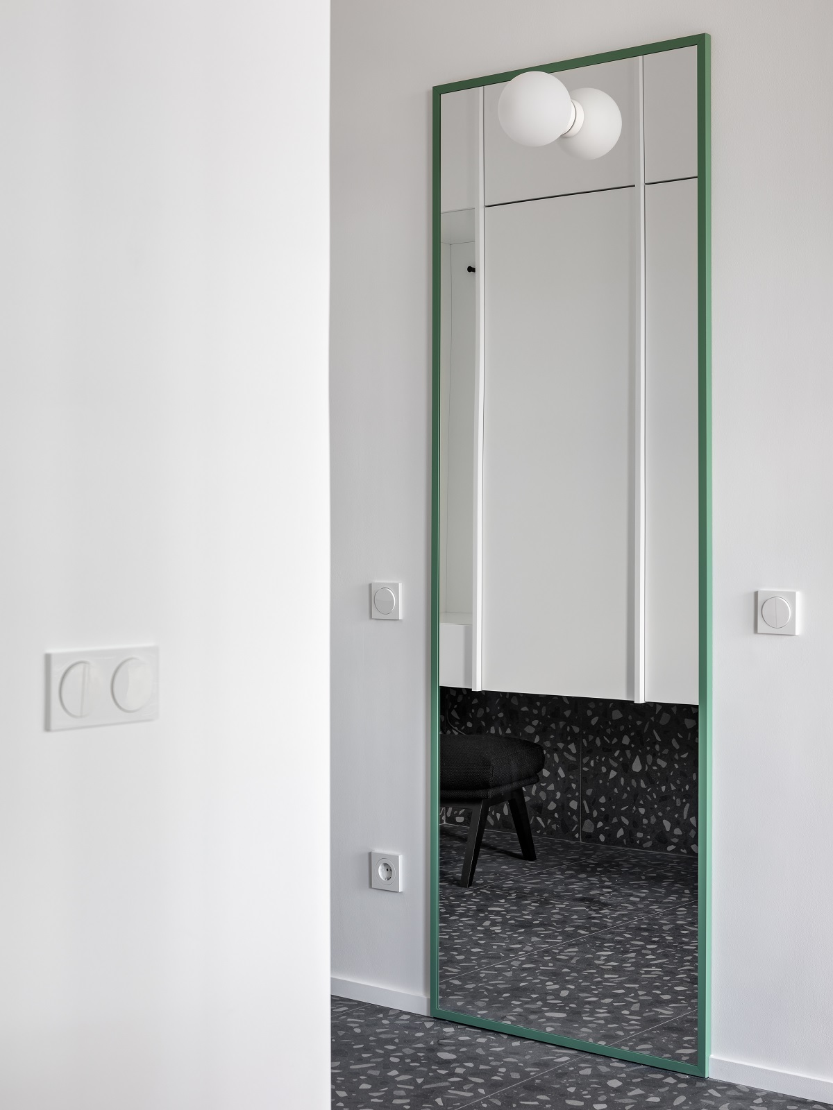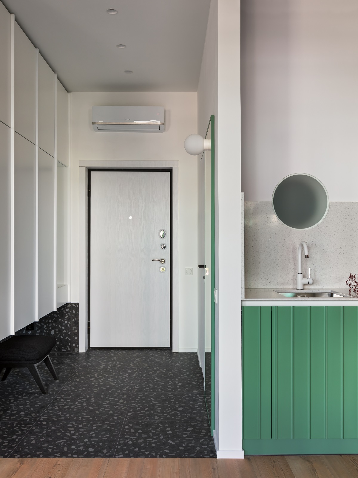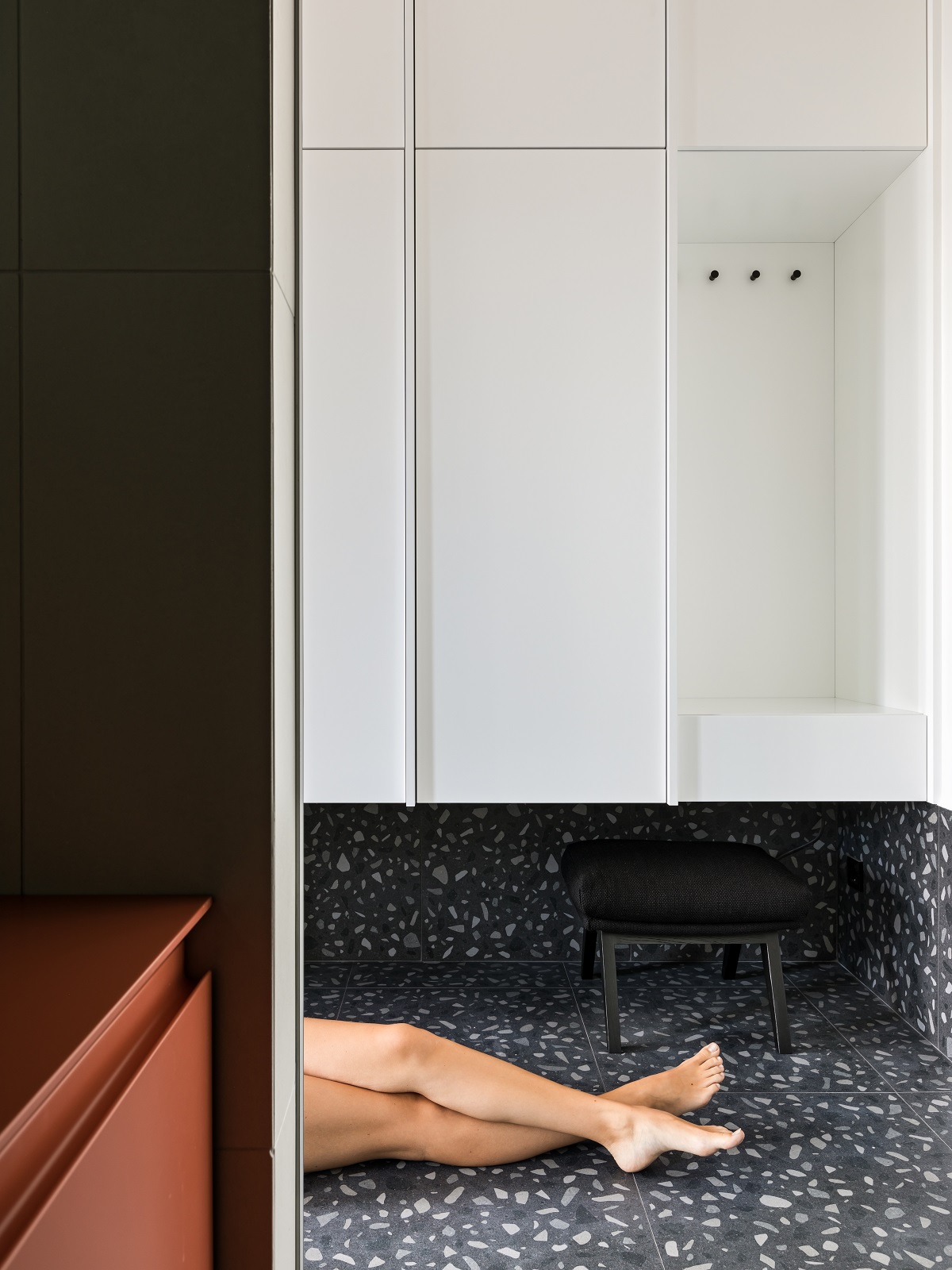 В прихожей использовали модную сейчас итальянскую плитку терраццо, а шкафы для хранения верхней одежды немного приподняли над полом.
