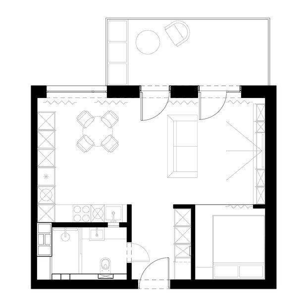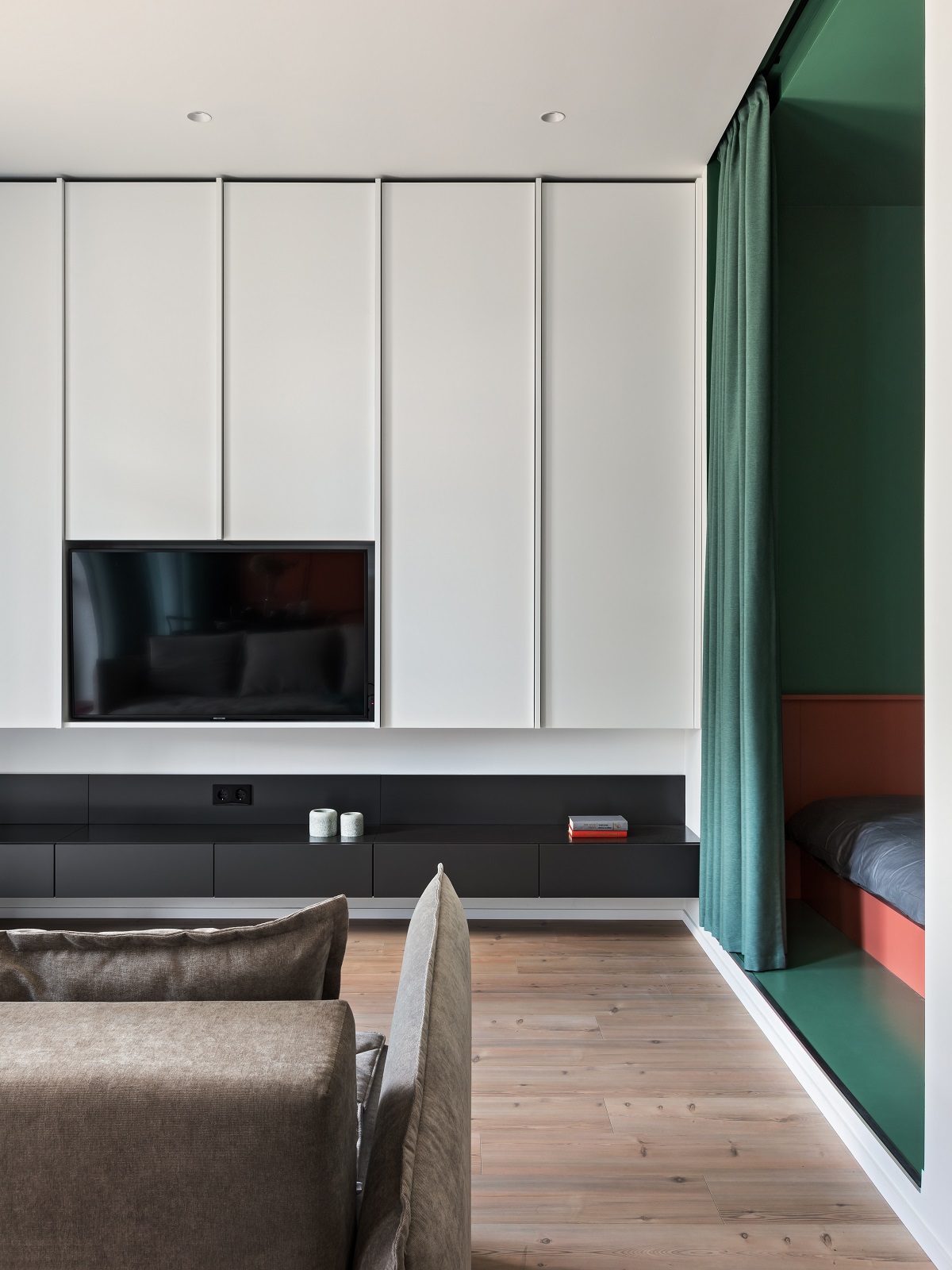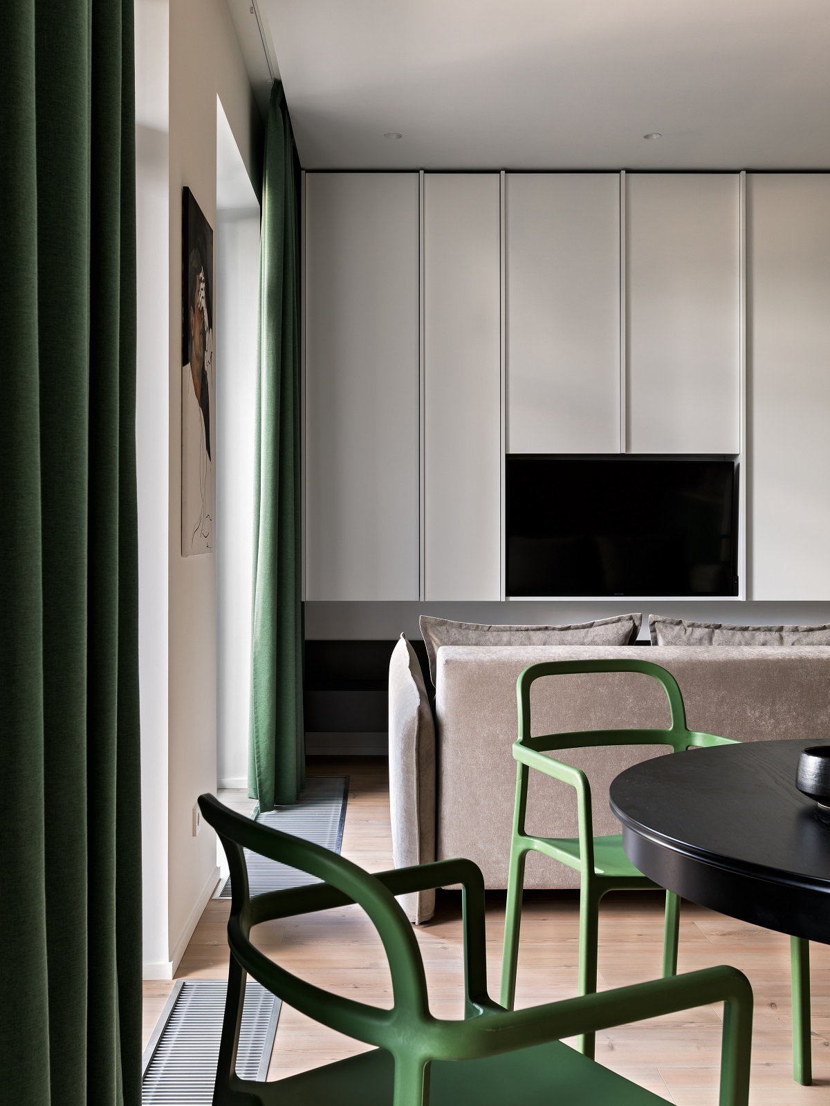 По словам архитектора-дизайнера Евгения Варковича, в этой квартире в новостройке изначально было пару перегородок, но в процессе ремонта их снесли. В новой версии проекта в пространстве удалось обустроить объединенную кухню с гостиной, отдельное спальное место за ширмой и совмещенный санузел с душевой кабиной.