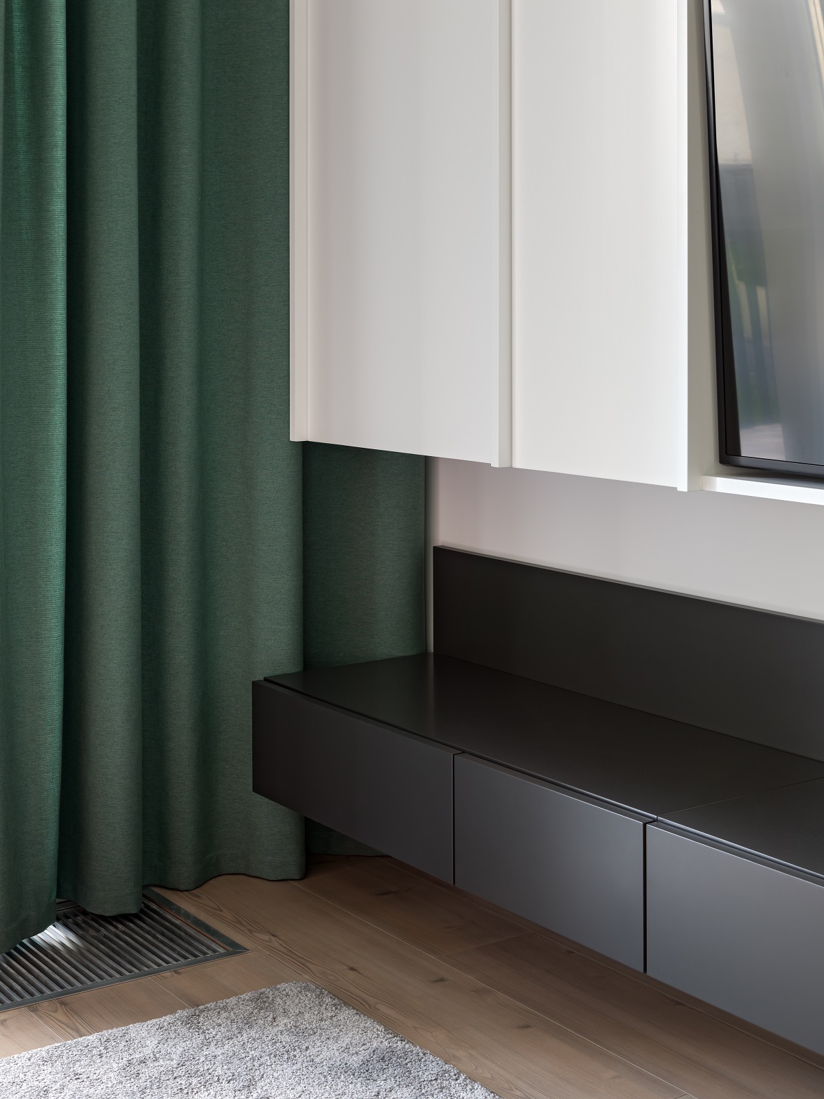– Прихожая небольшая, поэтому такой прием очень удобен: под шкафчики можно спрятать банкетку и обувь, чтобы они не мешали. Там же сделали розетку для робота-пылесоса.