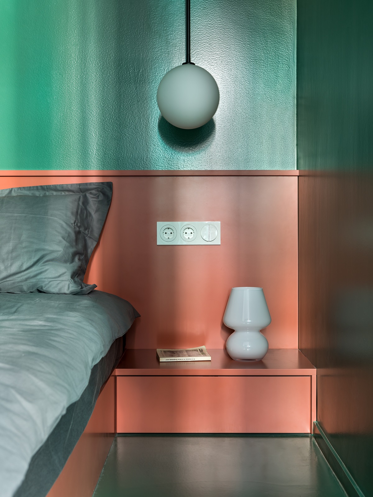 Пол, стены и потолок в зоне кровати выкрашены «антивандальной» краской, с которой легко можно отмыть любую грязь.