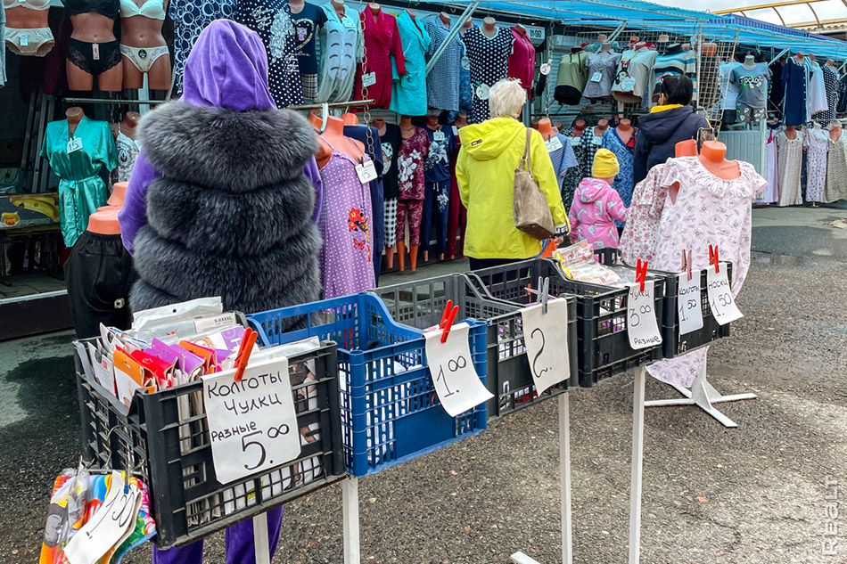 На улице, на открытом рынке, цены ниже. За 25 рублей можно купить джинсы, за такую же сумму – спортивный костюм или рубашку. Но покупателей, жалуются продавцы, все равно нет.