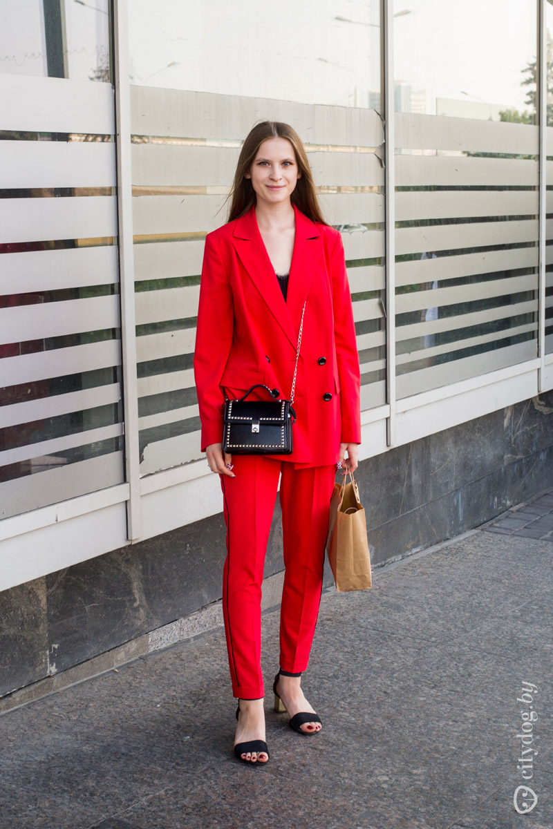 – Сегодня встречаюсь с подругой, поэтому решила одеться более ярко. Да и в целом люблю яркие вещи. Костюм из «Элемы» – я там как раз работаю.
