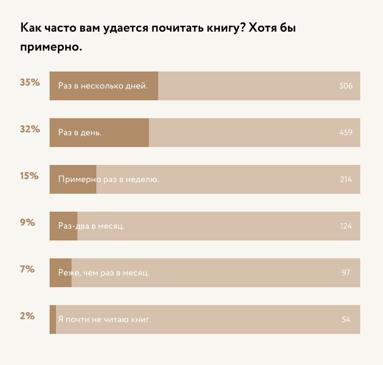 И еще 35% – раз в несколько дней. 15% находят время на книги примерно раз в неделю. Только 2% говорят, что почти не читают книг, а 7% – реже, чем раз в месяц.