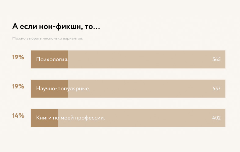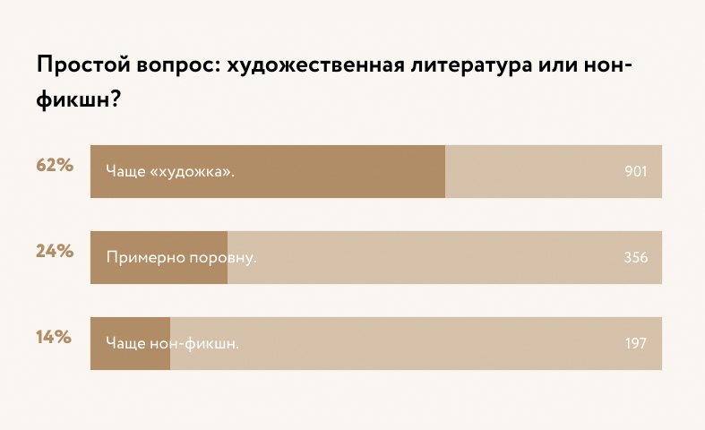 14% чаще читают нон-фикшн, а каждый четвертый – примерно поровну.