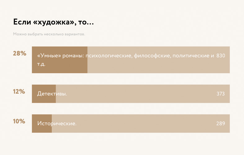 Из художественной литературы в топе – «умные» романы, детективы и исторические. А из нон-фикшна предпочитают психологию, научпоп и книги по своей профессии.
