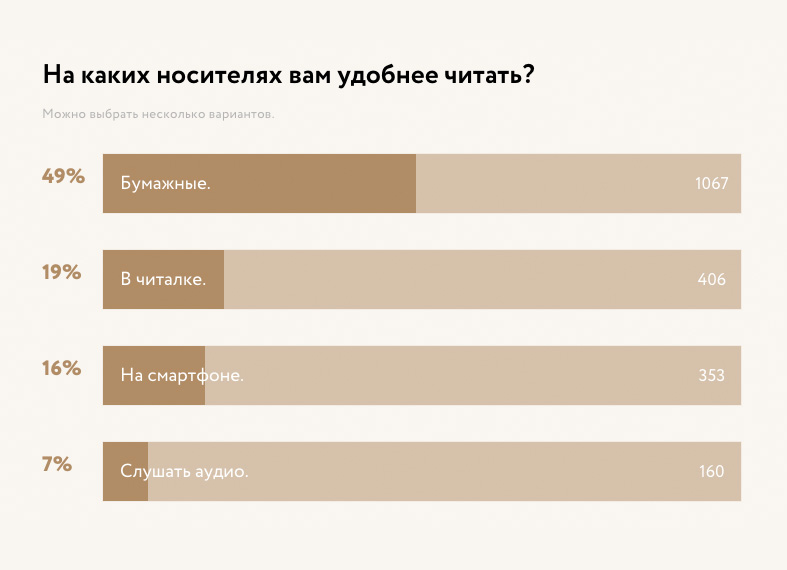 Каждый пятый пользуется читалкой, 16% читают на смартфоне. 7% говорят: удобнее слушать.