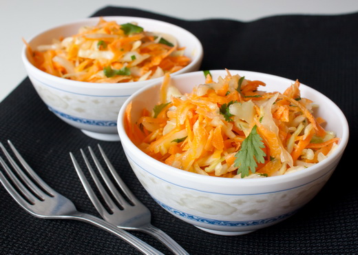 3. Переложить в салатник морковь, капусту, мелко нарубленный перчик, кинзу, зиру, масло, лаймовый сок, соль и перец. Перемешать.