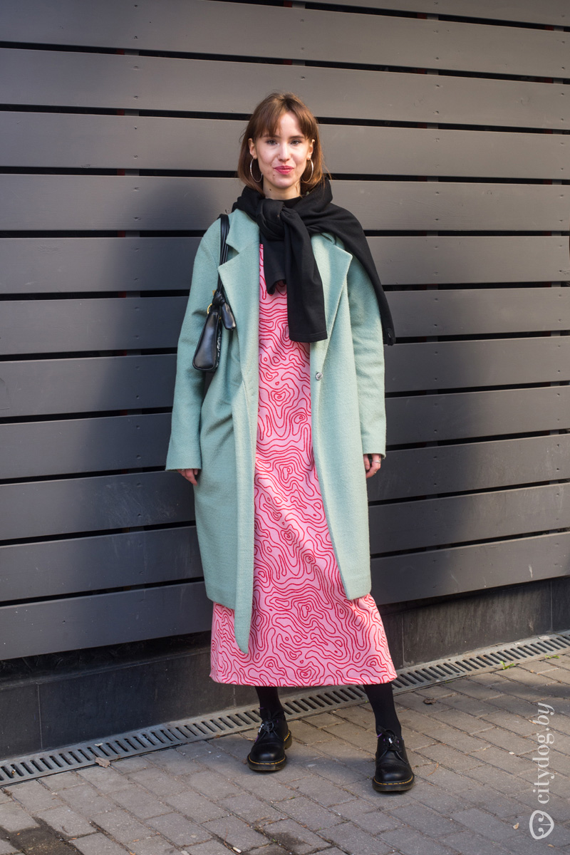 Одним из первых наше внимание привлек этот образ. Во-первых, из-за не самого стандартного (но однозначно интересного) сочетания цветов, во-вторых – из-за замысловатого принта на платье.