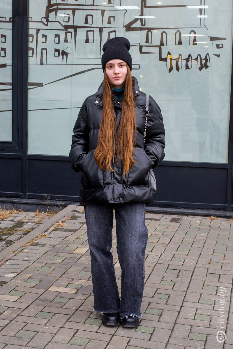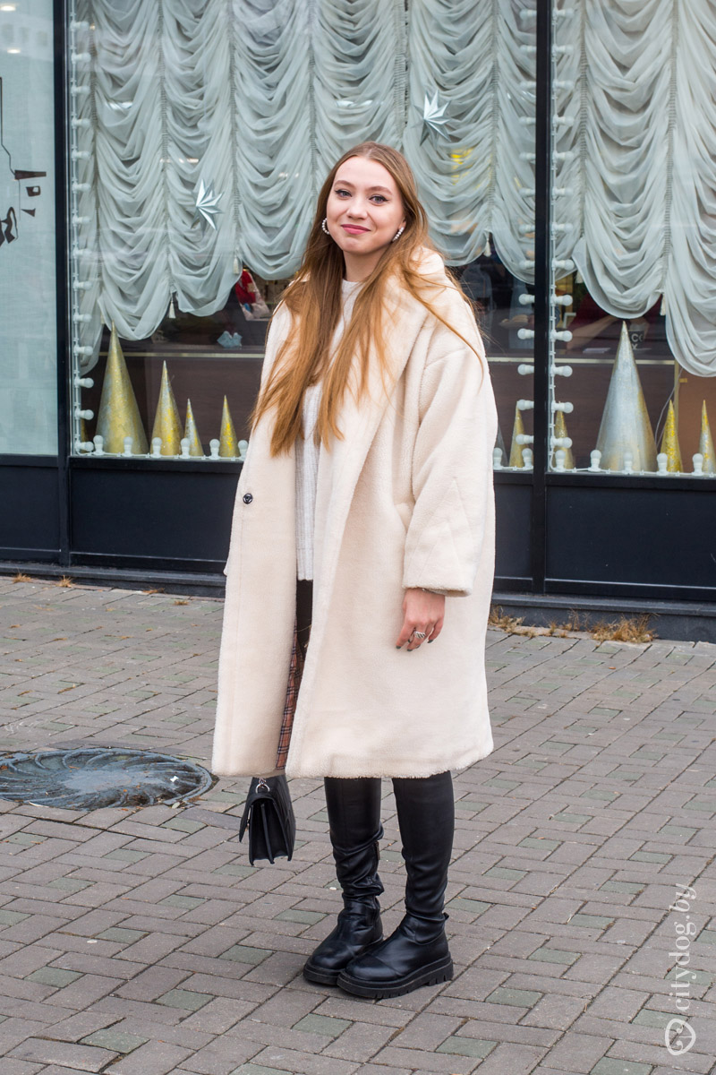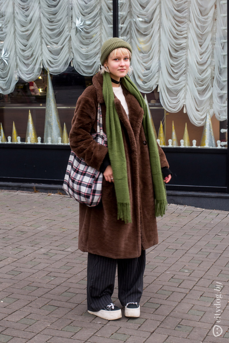 Раз уж мы начали группировать образы по верхней одежде, то дальше давайте посмотрим на бессмертную любимицу минчанок поздней осенью. Мы, конечно же, про плюшевые шубы. Редкие осенние выпуски «Уличной моды» обходятся без этого уютного и комфортного предмета – вот и сегодня нам встретились сразу две «чебурашки».