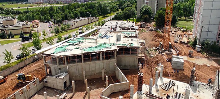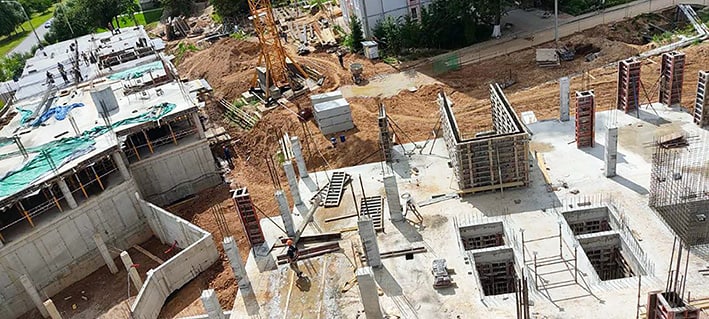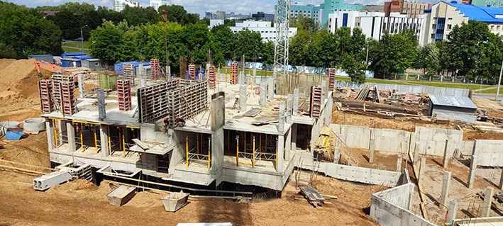 На обоих корпусах филиал СУ-13 стройтреста №4 вышел на уровень третьего этажа по монолитным работам. Строить планируют по 1,5 этажа в месяц.
