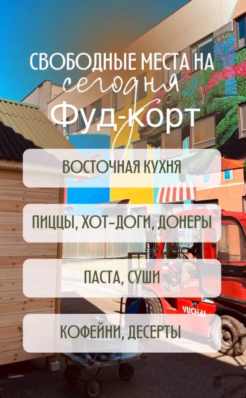 Открытие намечено на пятницу, 22 июля. По плану, фуд-корт будет работать каждый день до 1 ноября. В зимний период (с ноября до марта) – только по выходным. А в декабре-январе будет еще и зимняя ярмарка с елкой. С марта фуд-корт снова вернется в летний режим работы.