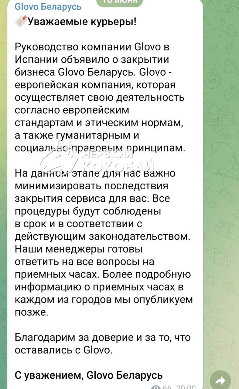Сервис быстрой доставки Glovo уходит из Беларуси. Об этом компания заявила в своей рассылке курьерам, сообщает блогер «Мерзкий Кокобай».