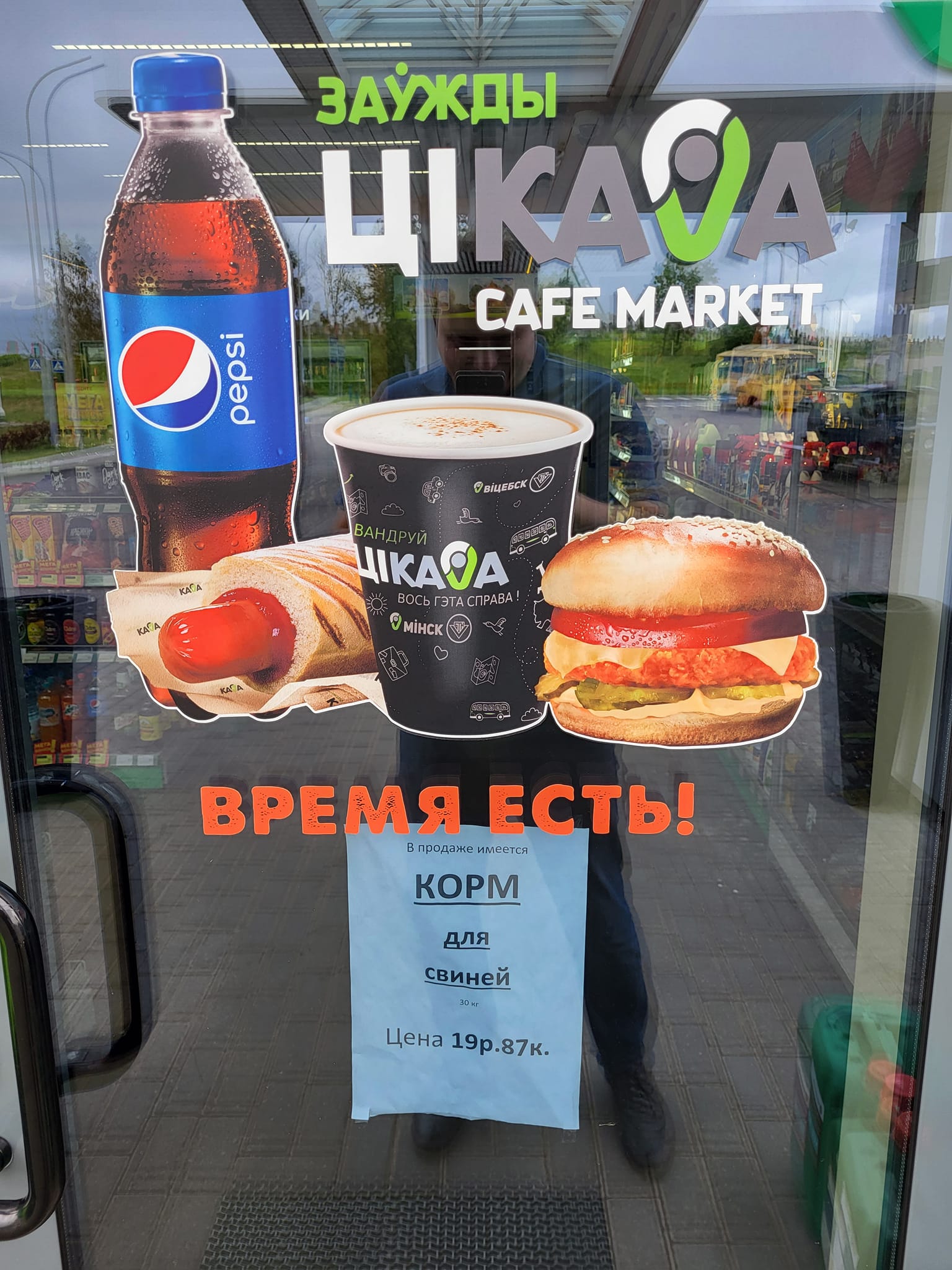 На фото – дверь автозаправочного кафе. А на ней – реклама еды и напитков, которые можно купить внутри, и объявление о том, что в продаже есть еще и корм для свиней, по 19,87 руб. за 30 кг. Листок с объявлением про корм приклеен прямо под фразой «Время есть!». Очевидно, что относится она к продуктам, изображенным выше. Но выглядит забавно.