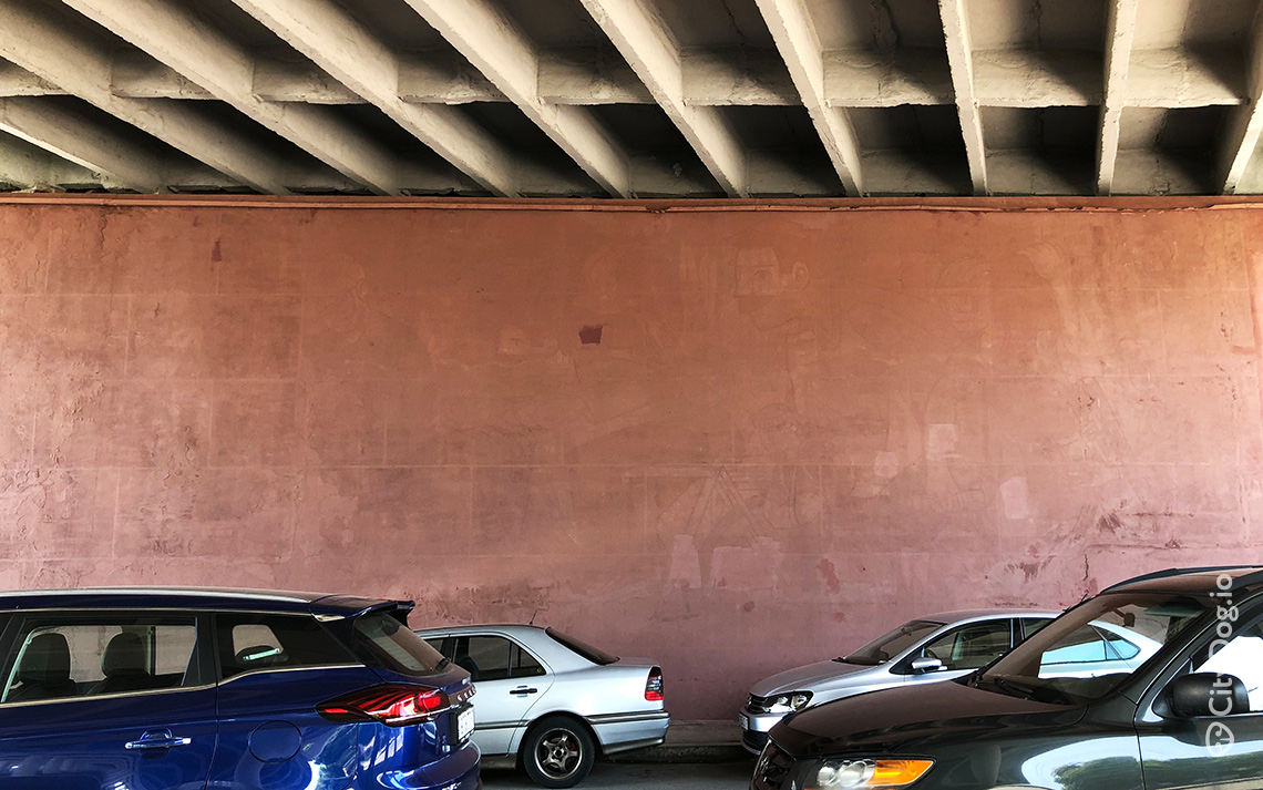 О мурале «Моментальность» мы подробно рассказывали здесь. Он появился в 2019 году под мостом на Бобруйской, слева от центрального входа на физфак БГУ, и был создан в рамках фестиваля Vulica Brasil. Его концепция – «Один миг из жизни города».